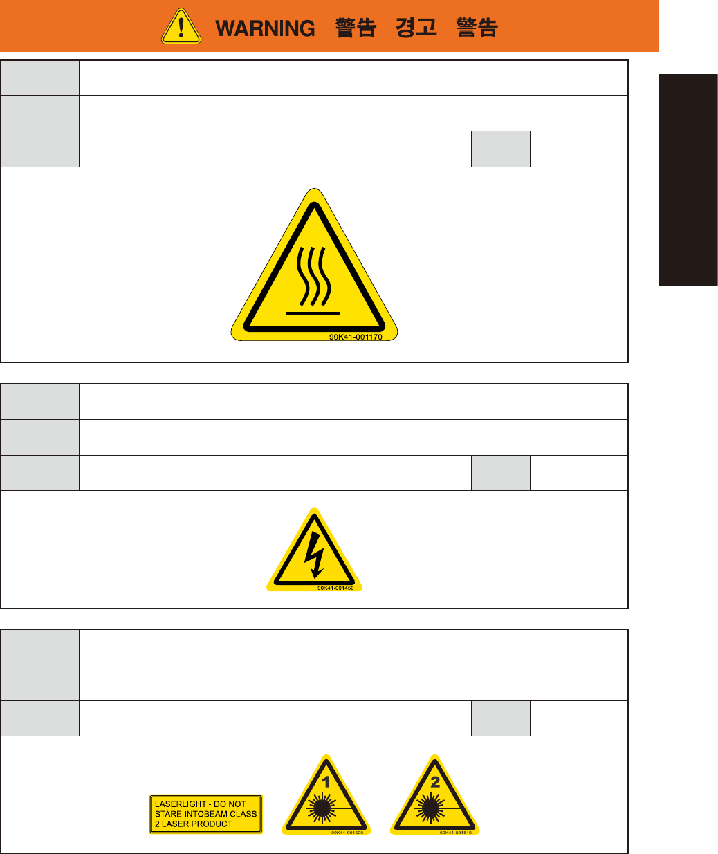 xix Safety instructions Potential hazard Burn hazard T o avoid hazard Heater becomes very hot during and shortly after operation, so do not touch it. Applicable machines YSD,YSH20 machines equipped with heater (option) C…