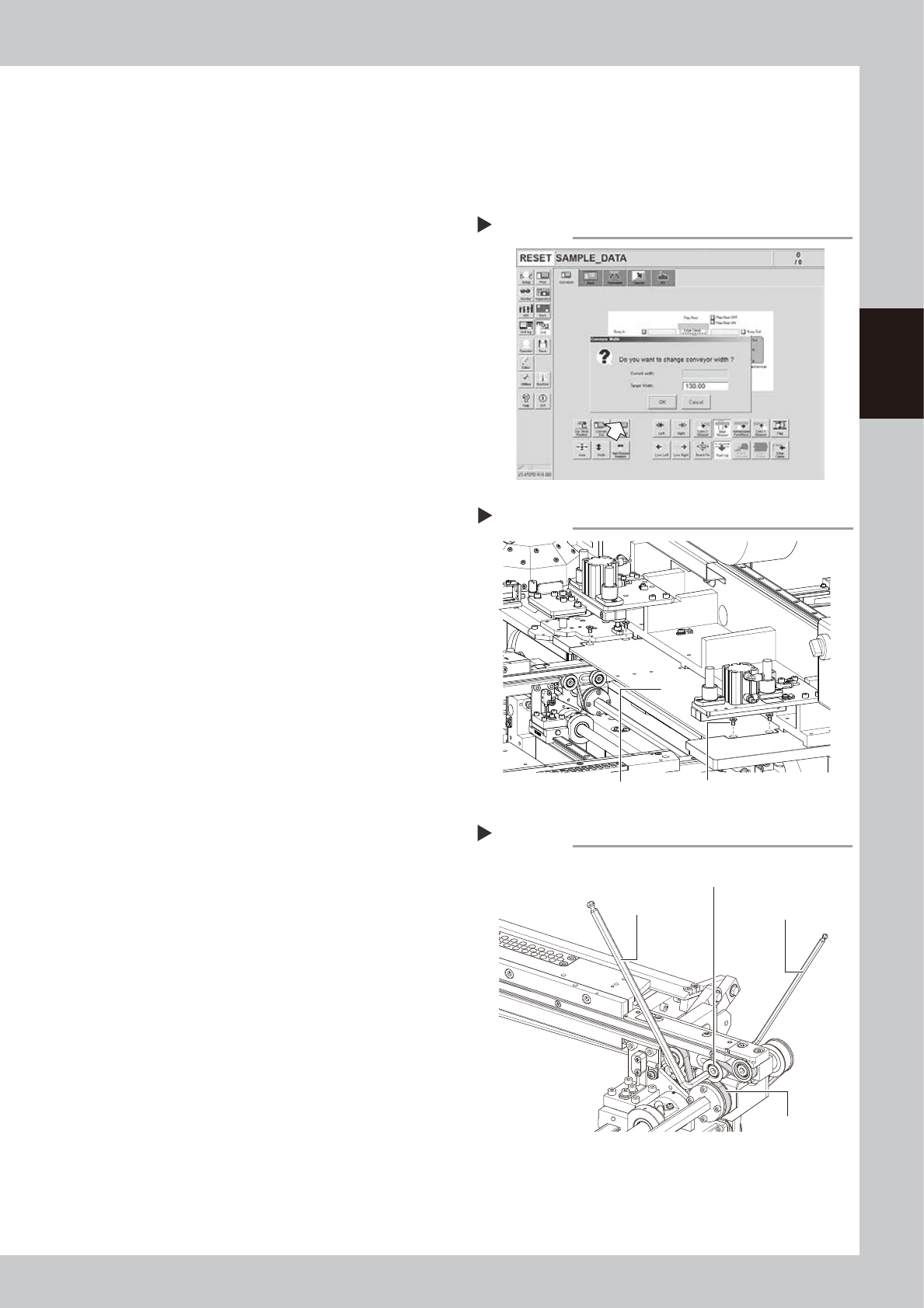 8-9 8 Inspection and maintenance 2.3.2 Board clamp unit (board clamp table) n Required tools • Hex wrench (3mm, 4mm, 5mm) 1 Change the conv ey or width to a conv enient width for maintenance work. 1. Press the [Width] bu…