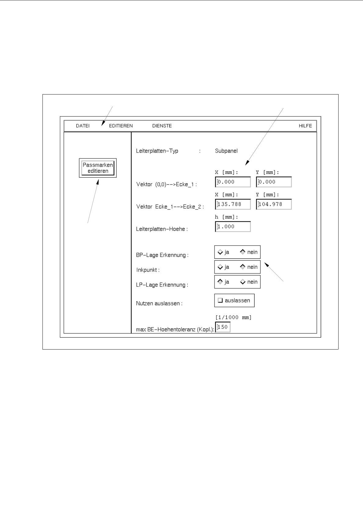 LP-Lage-Erkennung ein/aus, Bestücken ein/aus (Nutzen auslassen) und max. BE-Höhentoleranz für