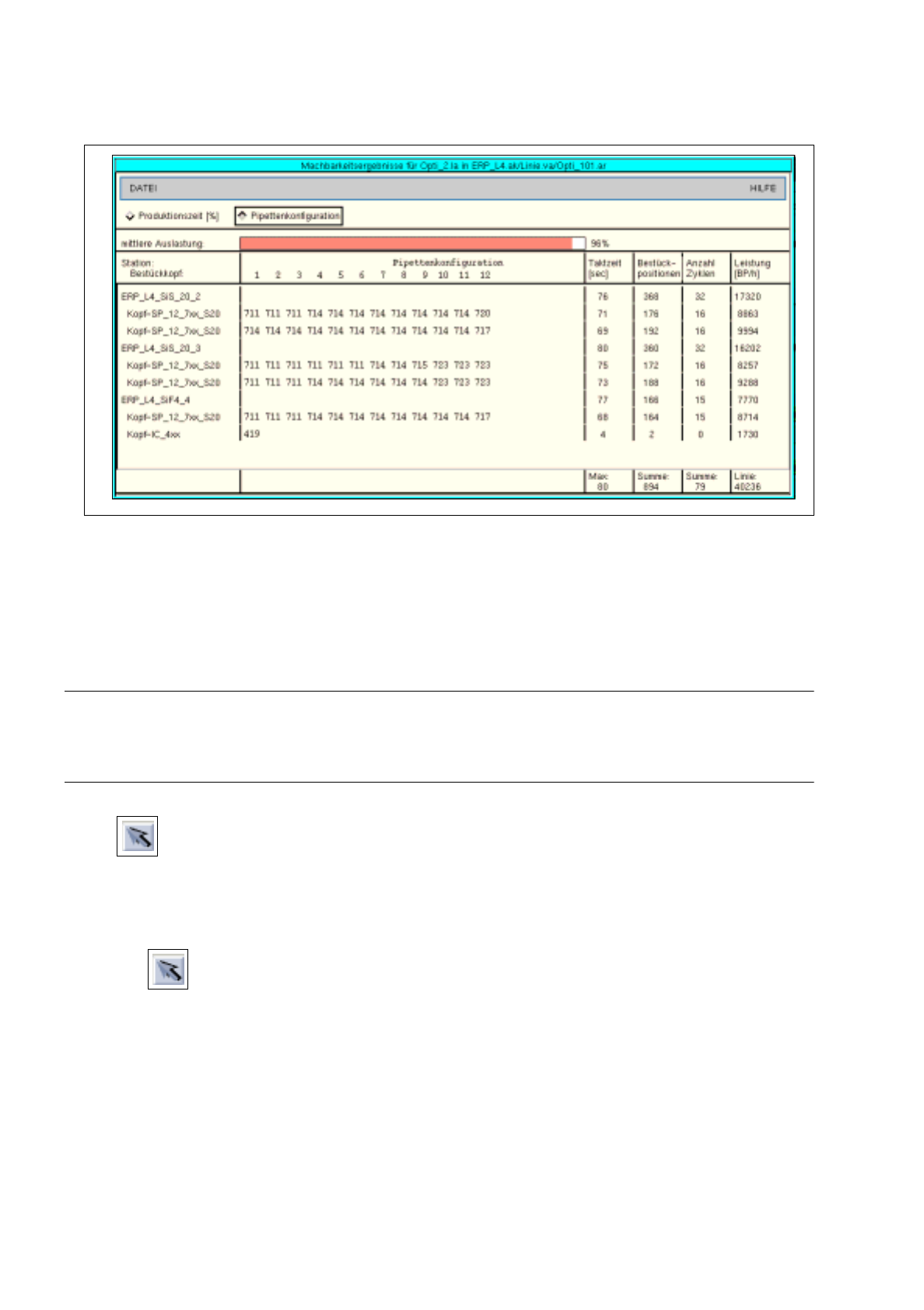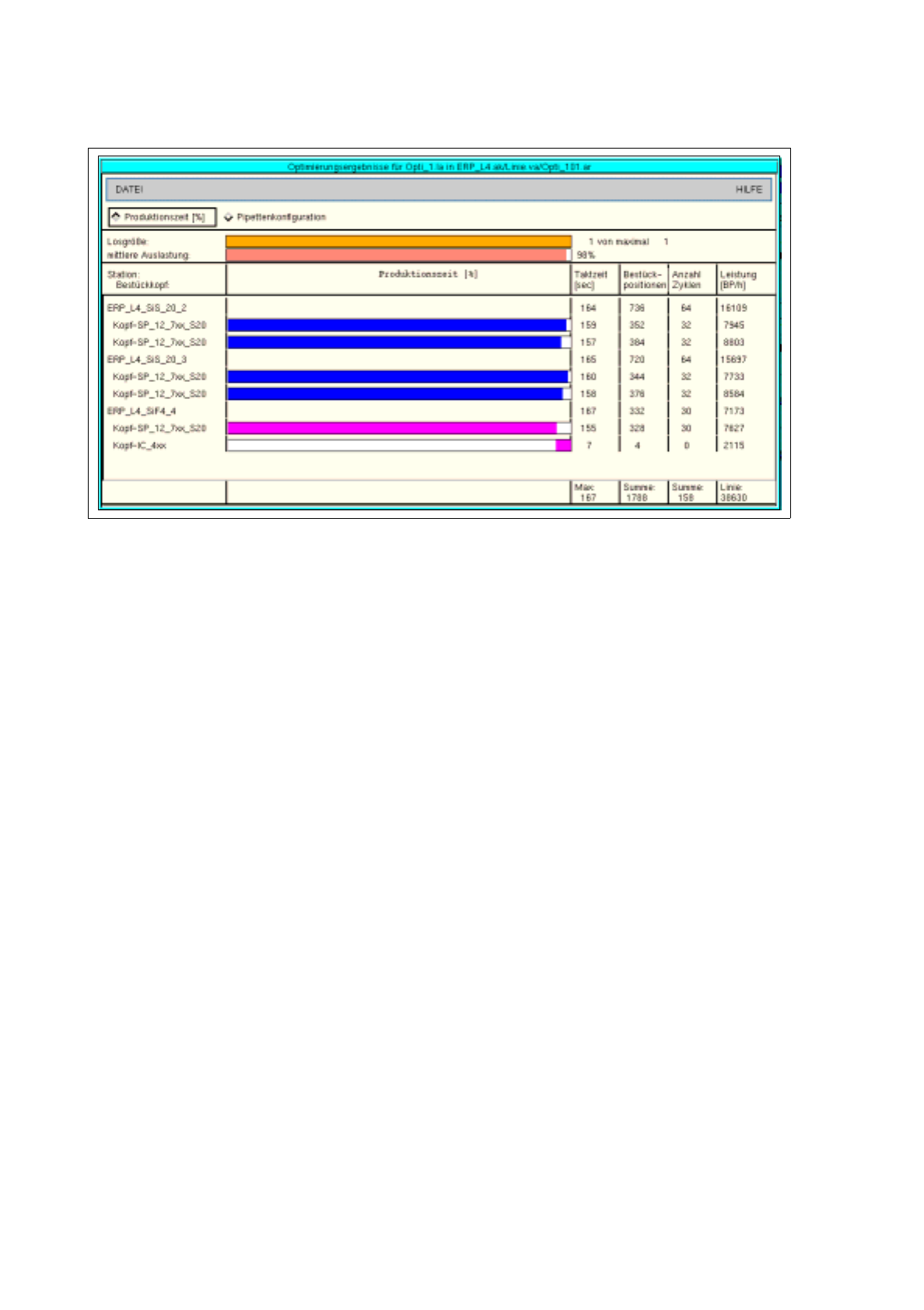 Für jede Station, jeden Bestückkopf und für die gesamte Linie sind die Ergebnisse der Optimierung in