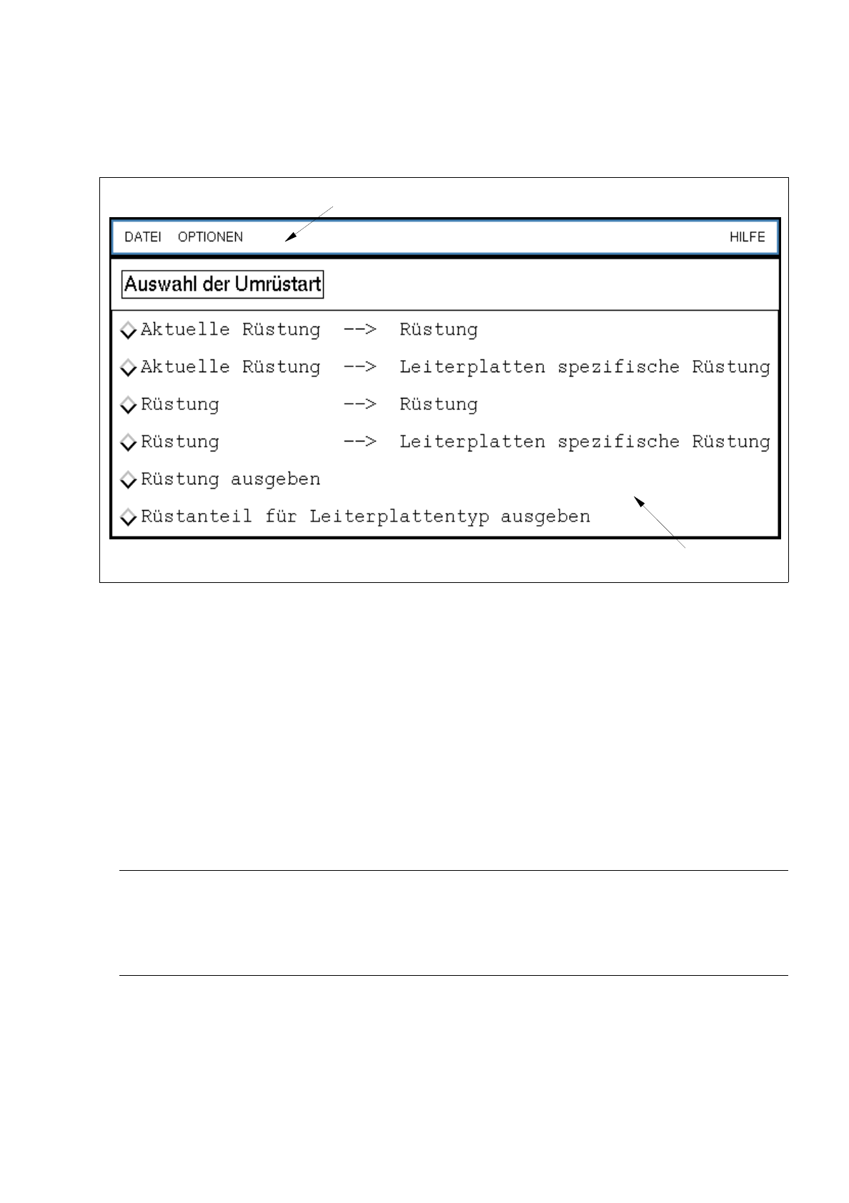 Hiermit kann der Bediener Umrüstanweisungen von der aktuellen Rüstung nach einer anzugebenden
