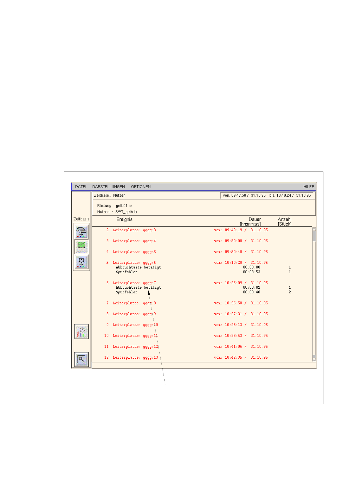 Im Diagramm der Auswerteform "Ereignisliste" werden alle von der gewählten Station produzierten Leiterplatten
