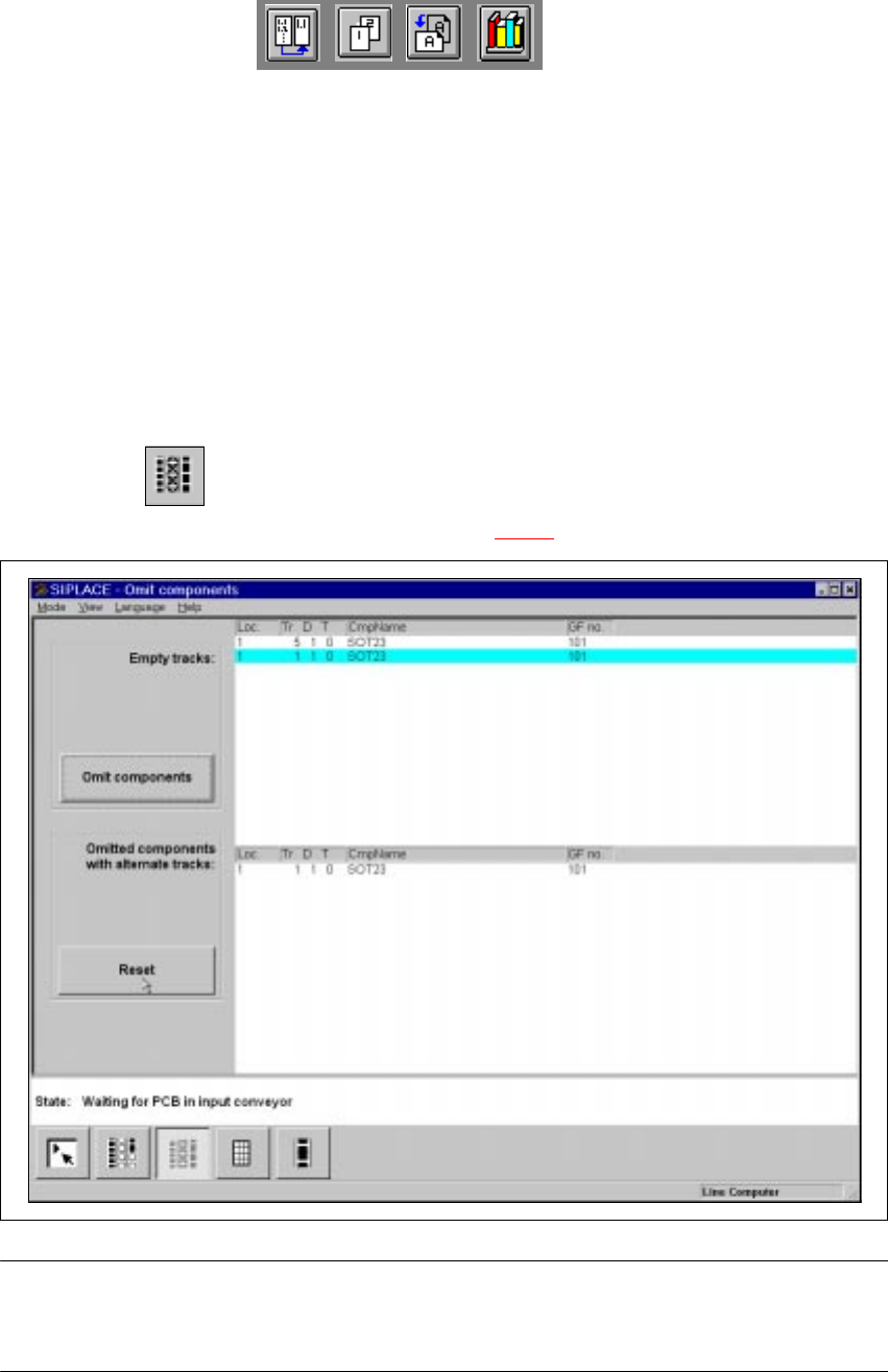 4 Placement Functions User Manual HS-50 4.3 Feeders Software Version SR.501.xx 12/99 Issue U S 150 t I I t 4.3.2 "Omit component s" view The “Omi t compone nts” functio n is u sed to del iberate ly le ave out c…