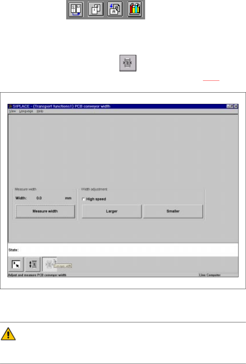 The "PCB conveyor width" screen makes available all functions necessary to adjust the width of