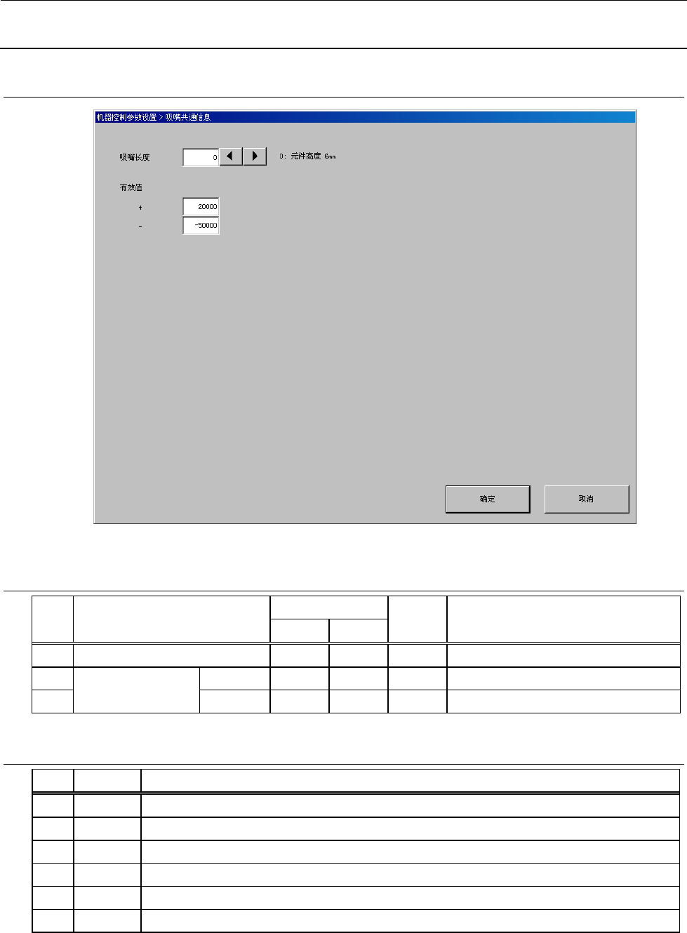 机器控制参数 2- 95 2-6-2 吸嘴共通信息 2-6-2-1 设定项目 No. 项目 输入范围 单位 备考 最小值 最大值 1 吸嘴 长度 mm 参照 2-6-2-2 吸嘴长度 2 有效值 + 3 − 2-6-2-2 吸嘴长度 No. 类别 内容 1 0 元件高度 6mm 2 1 元件高度 12m m 3 2 元件高度 20mm 4 3 元件高度 28 mm 5 4 元件高度 55mm 6 5 ~ 7 预备