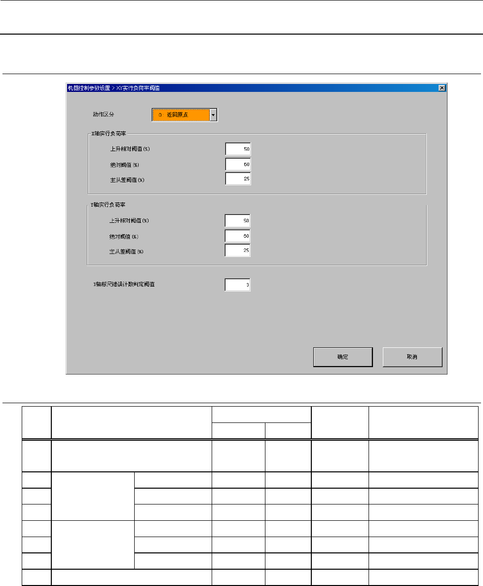 机器控制参数 2- 45 2-2- 10 XY 轴 有效 负载 率 阈值 2-2- 10 -1 设定项目 No. 项目 输入范围 单位 备考 最小值 最大值 1 动作区分 0 1 0 :返回原点 1 :生产 2 X 轴 有效负载 率 上升相对阈值 % 3 绝对阈值 % 4 主从差阈值 % 5 Y 轴有效负载 率 上升相对阈值 % 6 绝对阈值 % 7 主从差阈值 % 8 X 轴 标尺错误计数 判定阈值