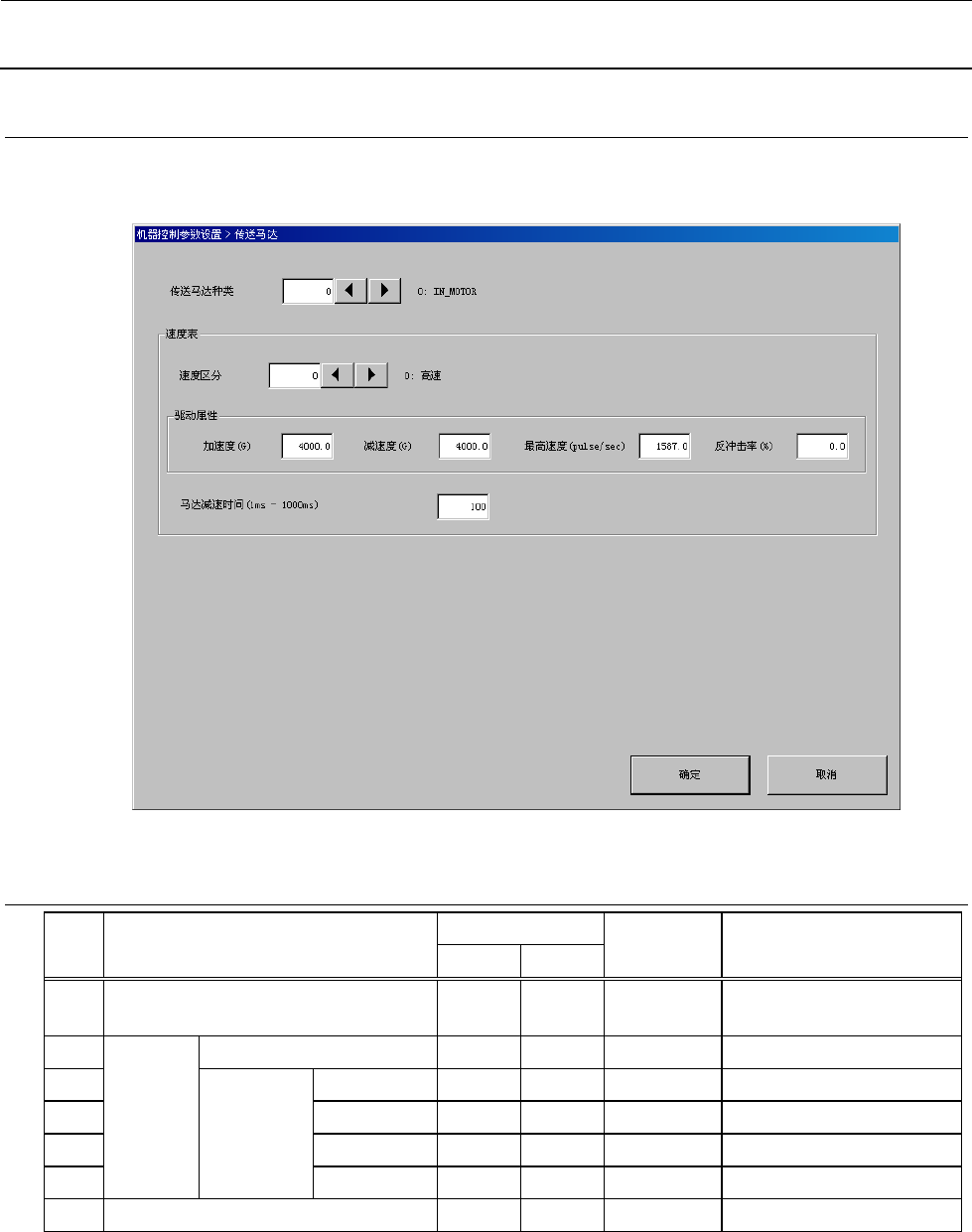 机器控制参数 2- 53 2-3-2 传 送 马 达 如将“传送马达种类” 设置为欲编辑的索 引,即可对所设置的区分 的速度表进行编辑 。 并且, 如将速度表的速度区分设置 为欲编辑的索引, 即可对所设置的区 分的驱动属性进行编辑。 2-3-2-1 设定项目 No. 项目 输入范围 单位 备考 最小值 最大值 1 传送马达种类 0 2 参照 2-3-2-2 传送马达种 类 2 速度表 速度区分 0 9 参照 2-3-2-3 速度区分 3…