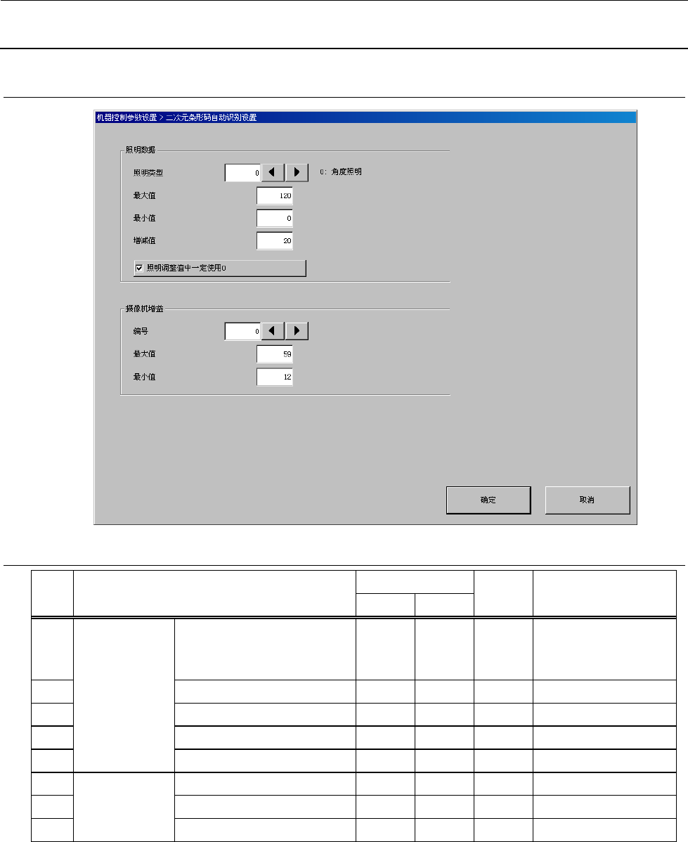 机器控制参数 2- 74 2-4- 12 二维条形码自动 识别设置 2-4- 12 -1 设定项目 No. 项目 输入范围 单位 备考 最小值 最大值 1 照明数据 照明类型 0 2 0 : 角度 照明 1 : 垂直照明 2 : 外圈 照明 (选项 ) 2 最大值 3 最小值 4 増减值 5 照明调整值中一 定使用 0 6 摄像机增益 编号 0 31 7 最大值 8 最小值