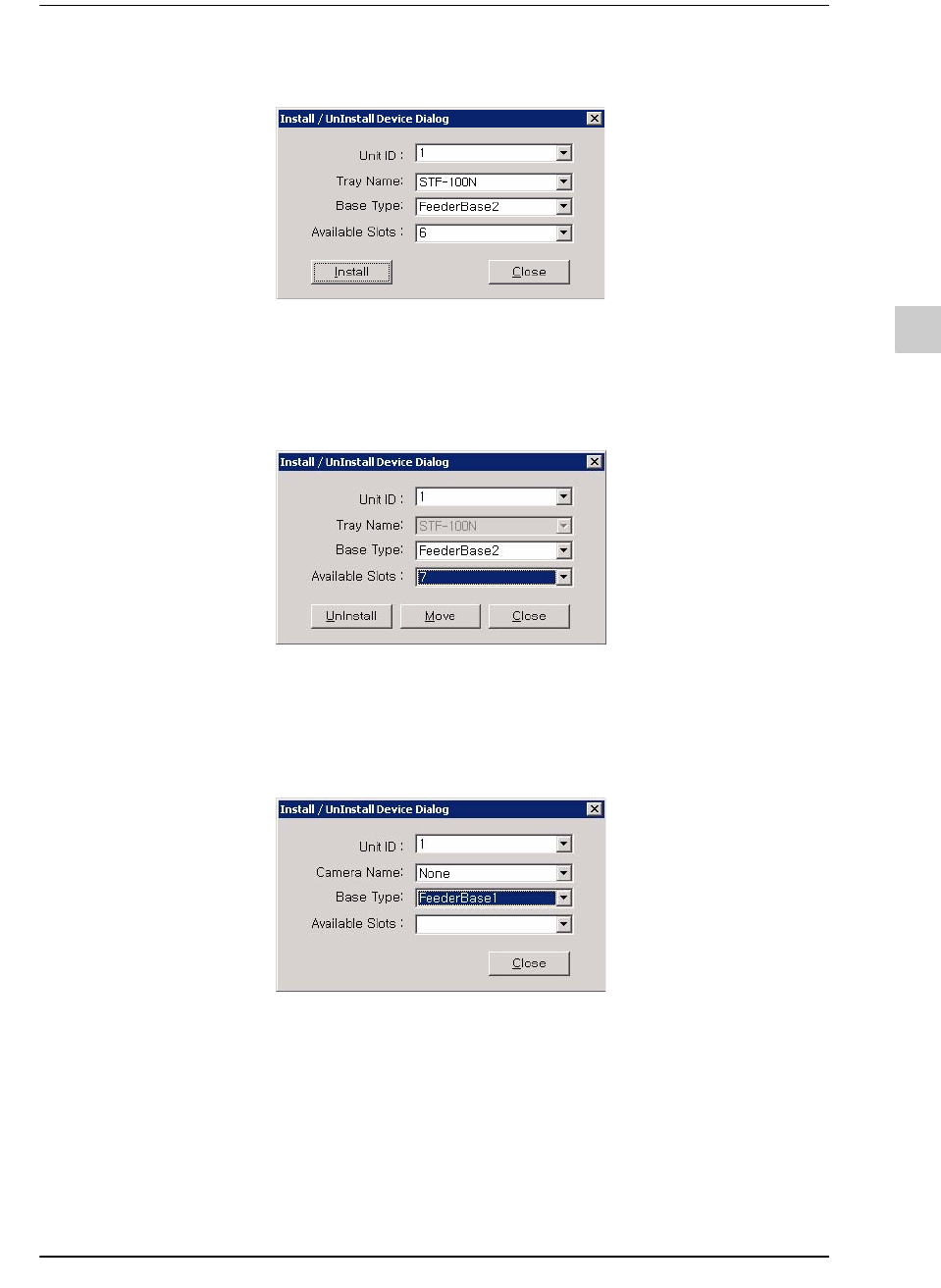 在Install/Uninstall Device Dialog窗口针对托盘式喂料器所做的设定内