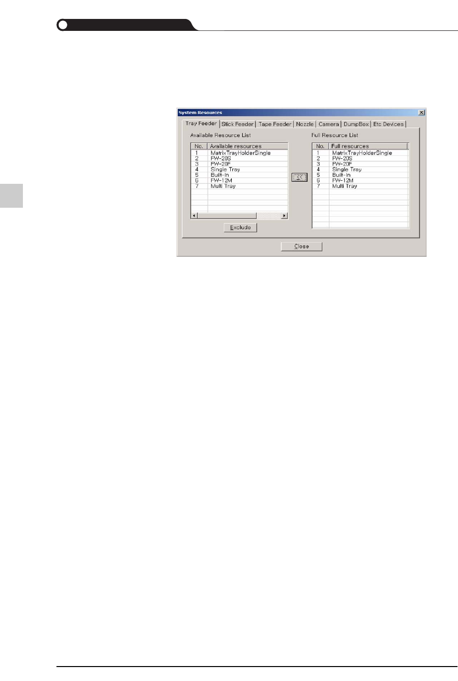 8-25 Line Modeler 举例来说, 如下图设定了设备时, 1,2 号设备在 A vailable Resource List 区不会显示任何选项, 3 号设备则显示相应的清 单。 A vailable Resource Lis 区的清单可以在系统更新时读入所有的相应信息。 如果是托 盘式喂料器, 则只能读入安装在当前设备并且正在使用的托盘式喂 料器。