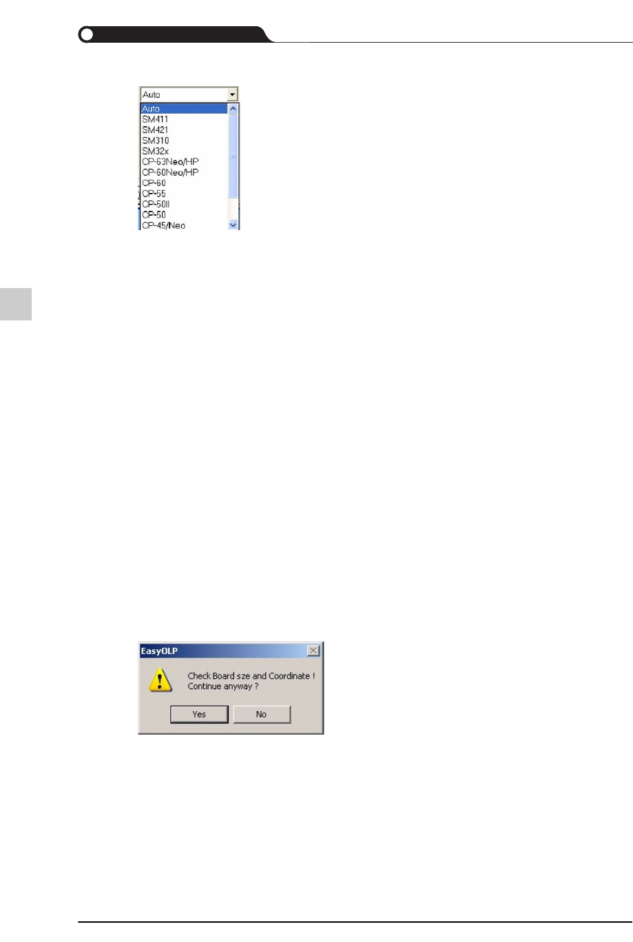 9-21 EasyOLP 9.3.2. Merge CAD 在当前打开的装贴点文件上合并其它 装贴点文件。 在已经打开了 Txt 文件或 PCB 文 件等文件的情形下打开新文件时将进 入激活状态。 由于 CAD 文件无法进行合并, 因 此该菜单不会被激活。 如果已经打开了 Txt 、 PCB 、 CAD 文件等各种格式的文件, 该菜单会随着当前选定的 文件而处于激活状态或非激活状态 。 选择了 CAD 文件时, 会处于非激活状态。 选择…