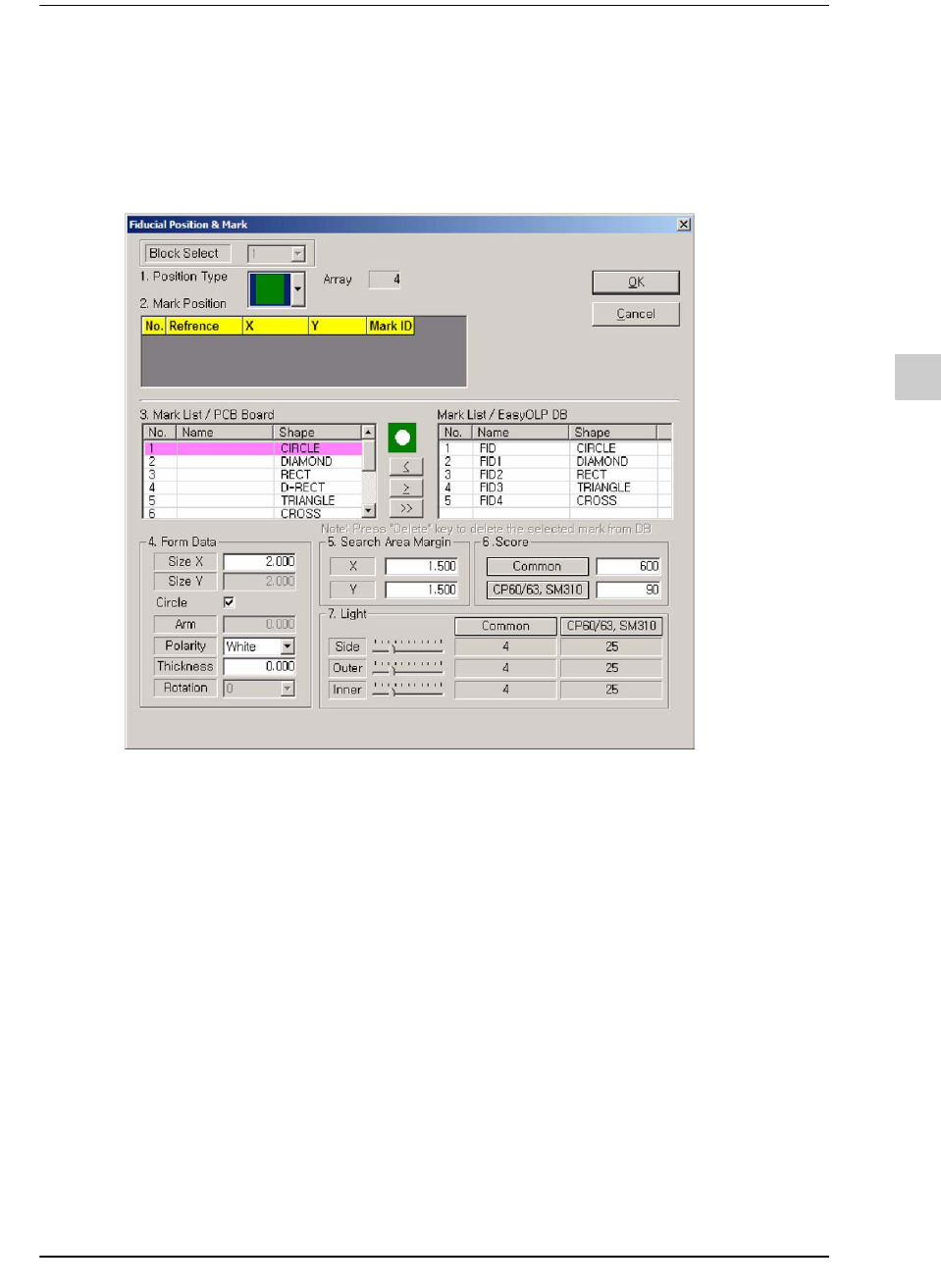 选择Tool > DB Fiducial Mark List菜单时,将弹出基准标志编辑对话框。在基准标志