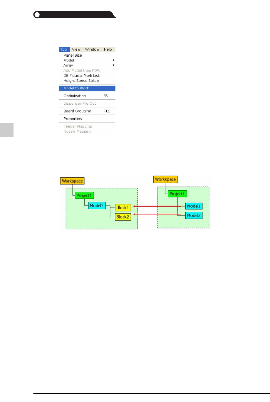 9-77 EasyOLP 9.6.5. Model-Block Switch 可以设置并更改 PCB 的电路板类型。 可轻易地把区块 PCB 转换成号 PCB 、 把型号 PCB 转换成区块 PCB 。 可以从区块转换到型号、 从型号转换到区块的区块数量为 2 个。 1) Block to Model switchi ng 2) Model to Block switchi ng 9.6.5.0.1. Bloc k to Model S…