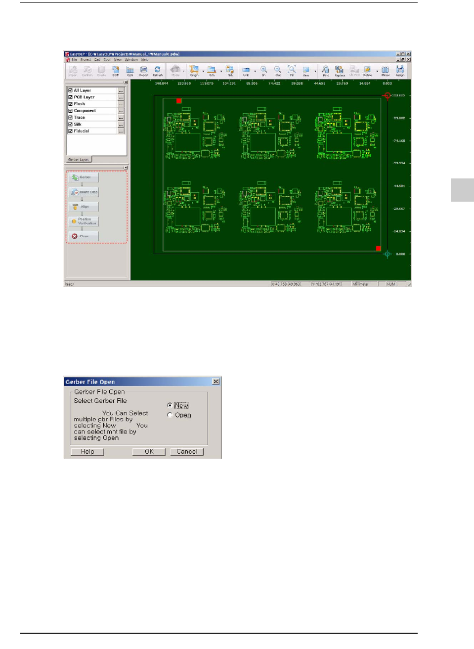 9-141 EasyOLP Figure9.16 Gerber Guidance View 在开始阶段, Gerber 层只显示 All Lay er 与 PCB Layer 。 EasyOLP 读入 Gerber File 后, 将另外显示 Gerber Layer 。 可以读入的 Gerber 文件是 RS-274X 或者 RS-2 74D 格式的 Gerber 文件, 或者是本公司 Gerber 接口程序 (Gerber 贴片机 …