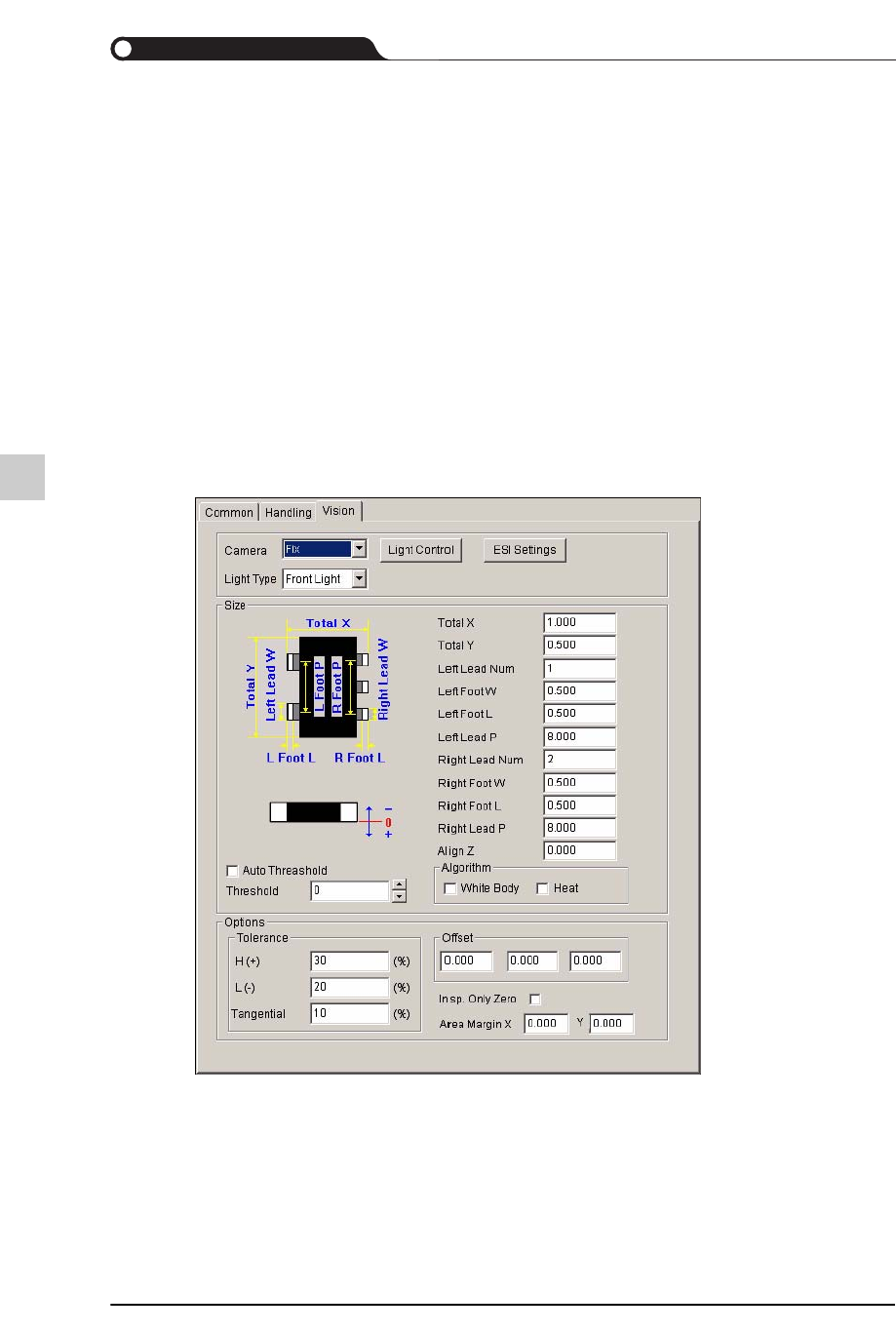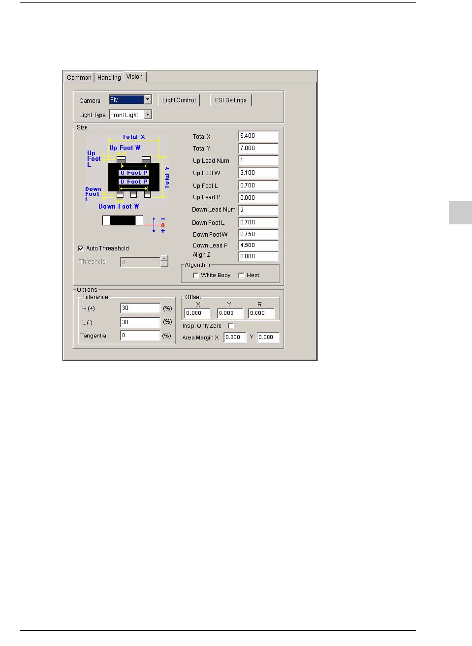 10-37 Part Browser 10.5.3.3. TR 设定 TR 元件的 Align 数据。 各细项的说明如下。 Auto Threshol d 在元件数据库编辑器 (Part Edi tor) 自动设定 Threshold 值。 Threshold 将处于非激活状态。 Threshold 在元件识别的前处理过程中, 把 Gray Level 的图像转换成 Binary( 二 进位 ) 时区分黑白的基准值。 可以区别背景与元件…