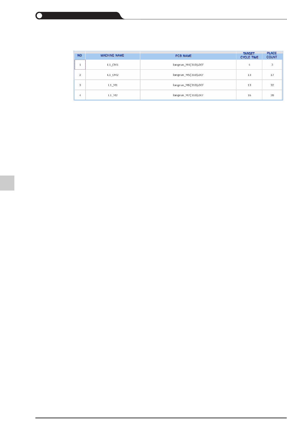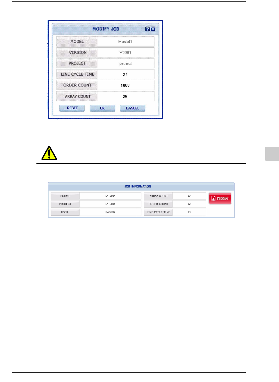 12-21 Single Line Monitorin g(SLM) 在 “Modify JOB” 对话窗口单击 <Reset> 键就能在保持当前 PCB 作业信息的情形 下把监控到的数据加以初始化。 注意 需要在设备 MMI 中单击 <RESET> 键后把生产信息初始化。 2) 显示出所选定的 PCB 生产作业的作业信息。