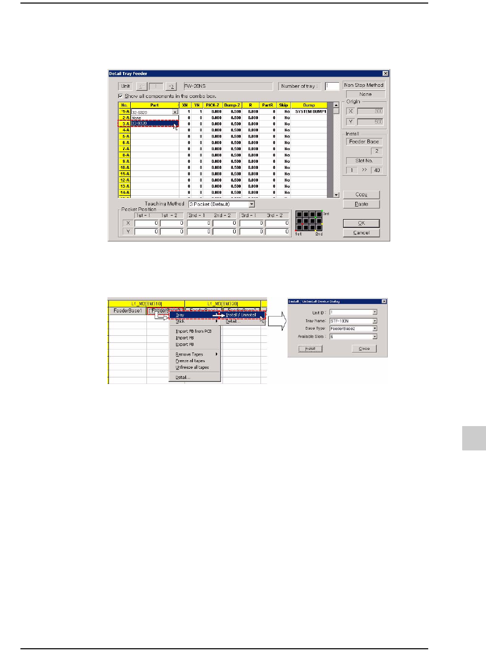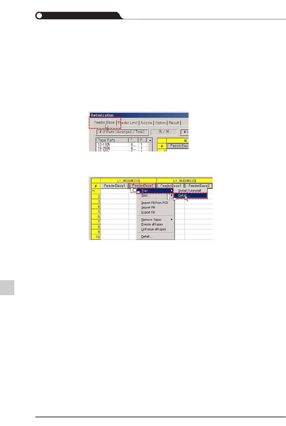 19-8 lvswG}] lvswG}] 19.2. 托盘式喂料器及管式喂料器的手动配置 在各设备的喂料器底座上配置托盘式 喂料器或管式喂料器。 托盘式喂料器与管式喂料器的配置几 乎完全相同, 因此本手册只对托盘式喂料器进 行说明。 . 托盘式喂料器的配置顺序如下。 STEP1. 在 Optimization 对话框单击 Feeder Base 选项卡。 STEP2. 单击需要安装托盘式喂料器的设备 的喂料器底座后选择 Tr…