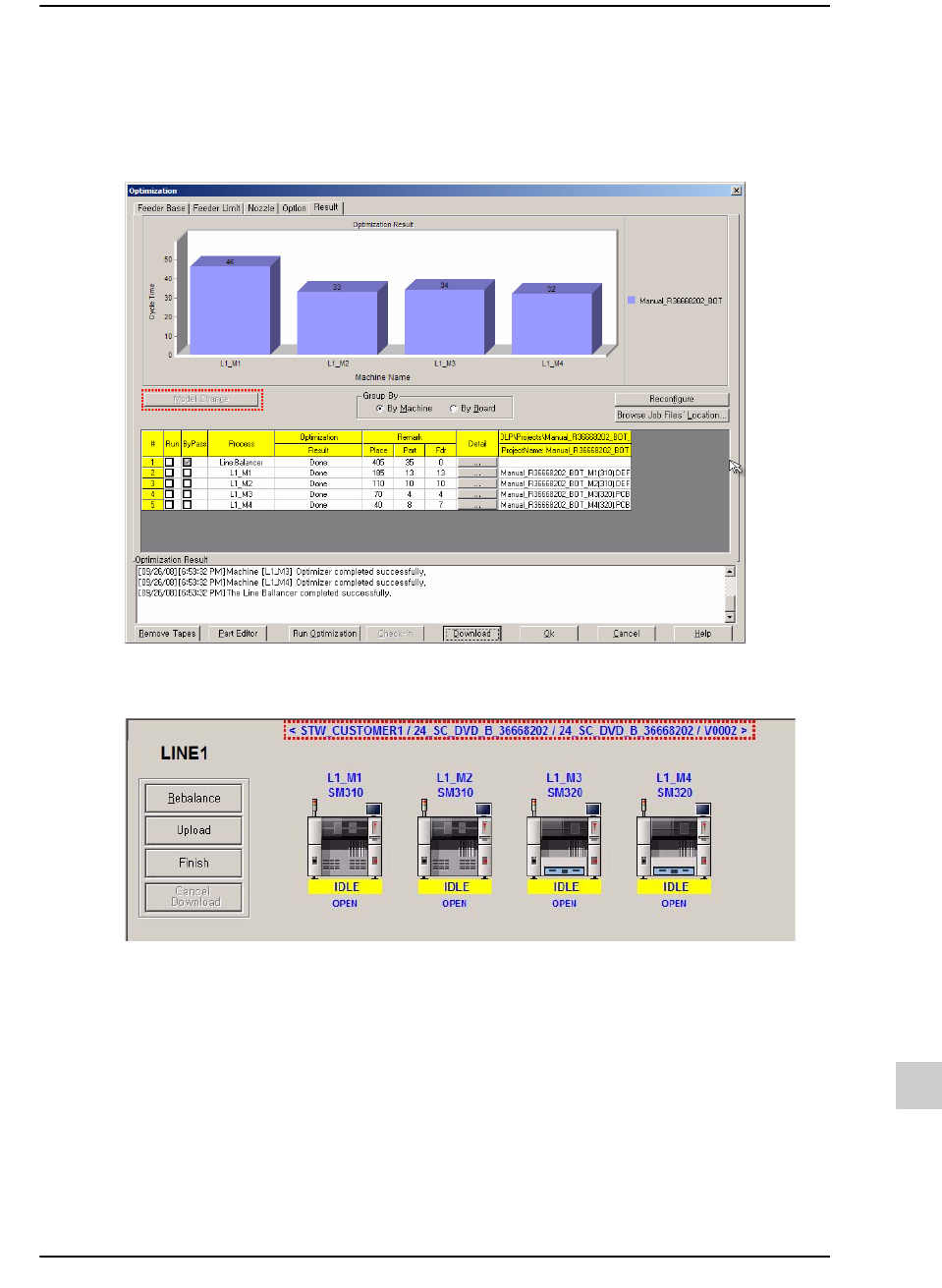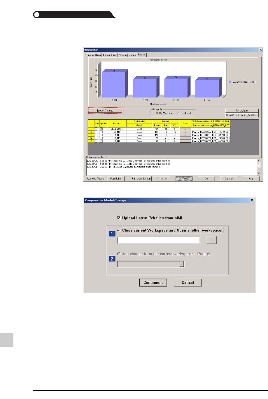 24-3 进程中变更型号 (PMC) 24.2. EasyOLP Progressive Model Change 设定了 PMC(ProgressiveModelChange) 后, 将在 EasyOLP 的 Optimization 对话框里出 现 <Model Change> 键。 <Model Change> 键将在更改后续型号时变成激 活状态。 下载了 PCB 文件后在设备打开该 PCB 文件并进行生产…