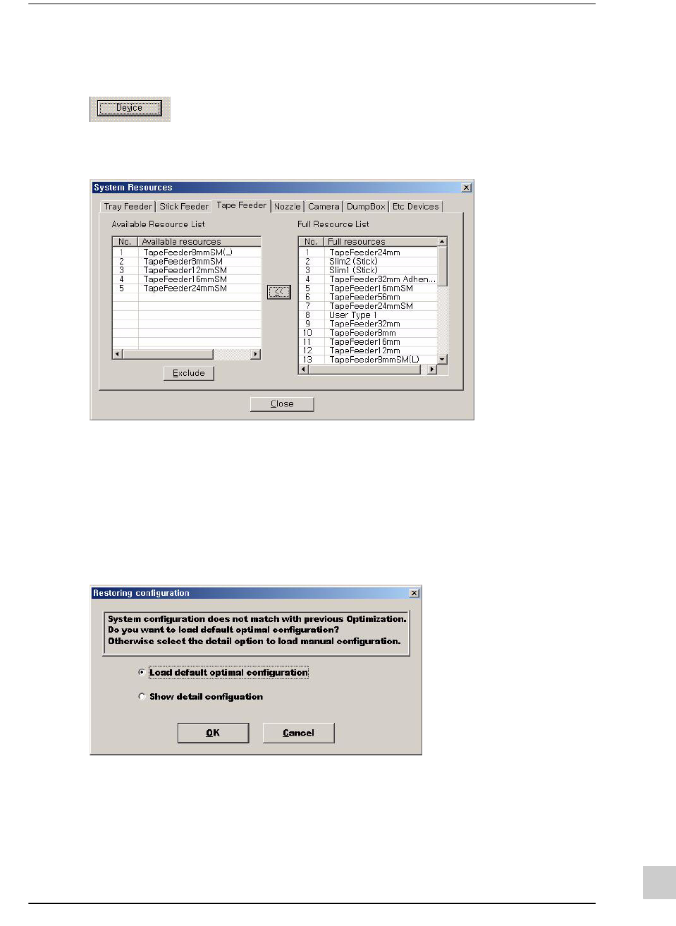 在System Resources对话框 > Tape Feeder选项卡的左侧Available Resource List上检