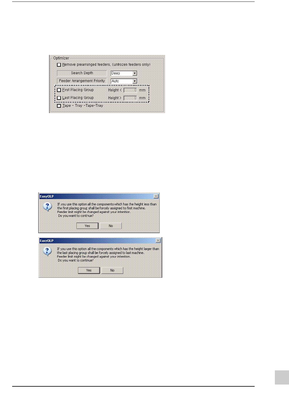 27-15 Technical Notes 确认方法 1) 圈选 Optimization 对话框的 Optio n 选项卡。 查看 Optimizer 区的 First Placing Group 与 Last Placing Group 是否被圈选。 解决措施 圈选 First Placing Group 与 Last Placing Grou p 时, Line Balancer 将根据所设定的条件 把元件强制性地配置给第一个与最…
