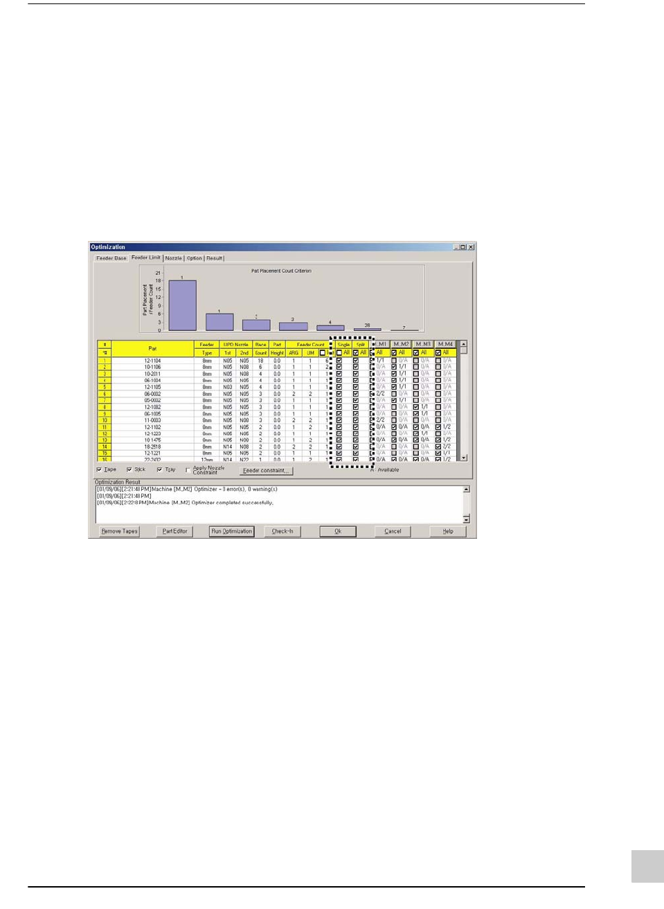 化结果(各设备的贴装点数量)、Optimizer结果、以及喂料器与吸嘴的数量是否充