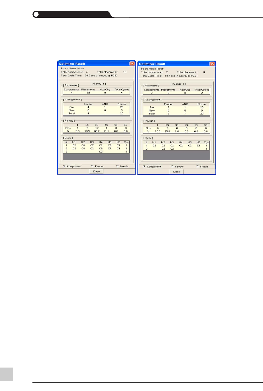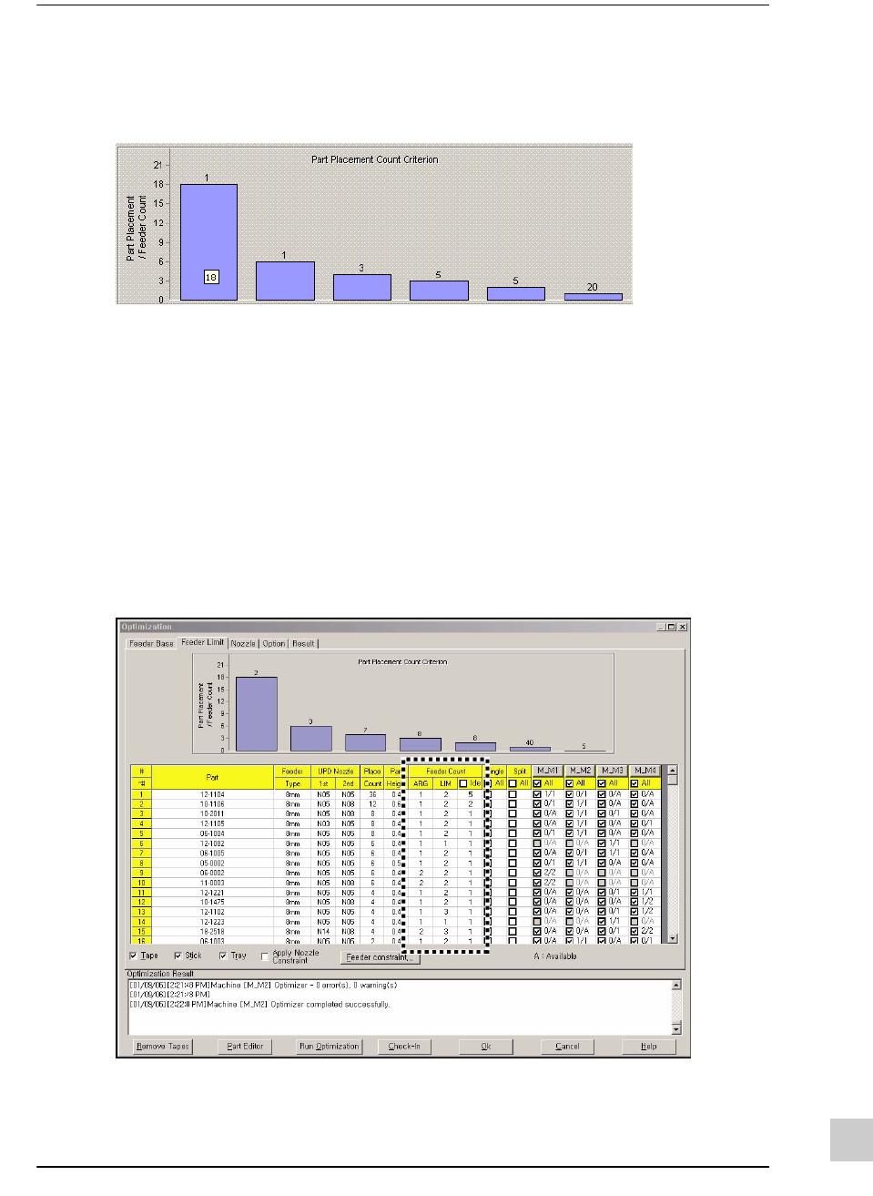 27-25 Technical Notes 把鼠标移到条状图上即可查看一个喂 料器在进行作业时的贴装点数量。 此时条状图 上端的数字指示针对同一贴装点数量 进行作业的喂料器数量。 也就是说, 第一个条 状图指出了对 18 个贴装点进行作业的喂料器数量为 1 个。 下图的红色区域是喂料器数量范围的 设定区。 Feeder Count 栏目由 ARG 、 LIM 及 Ideal 组成, 各项内容如下。 ARG Arranged 的缩写, 表…