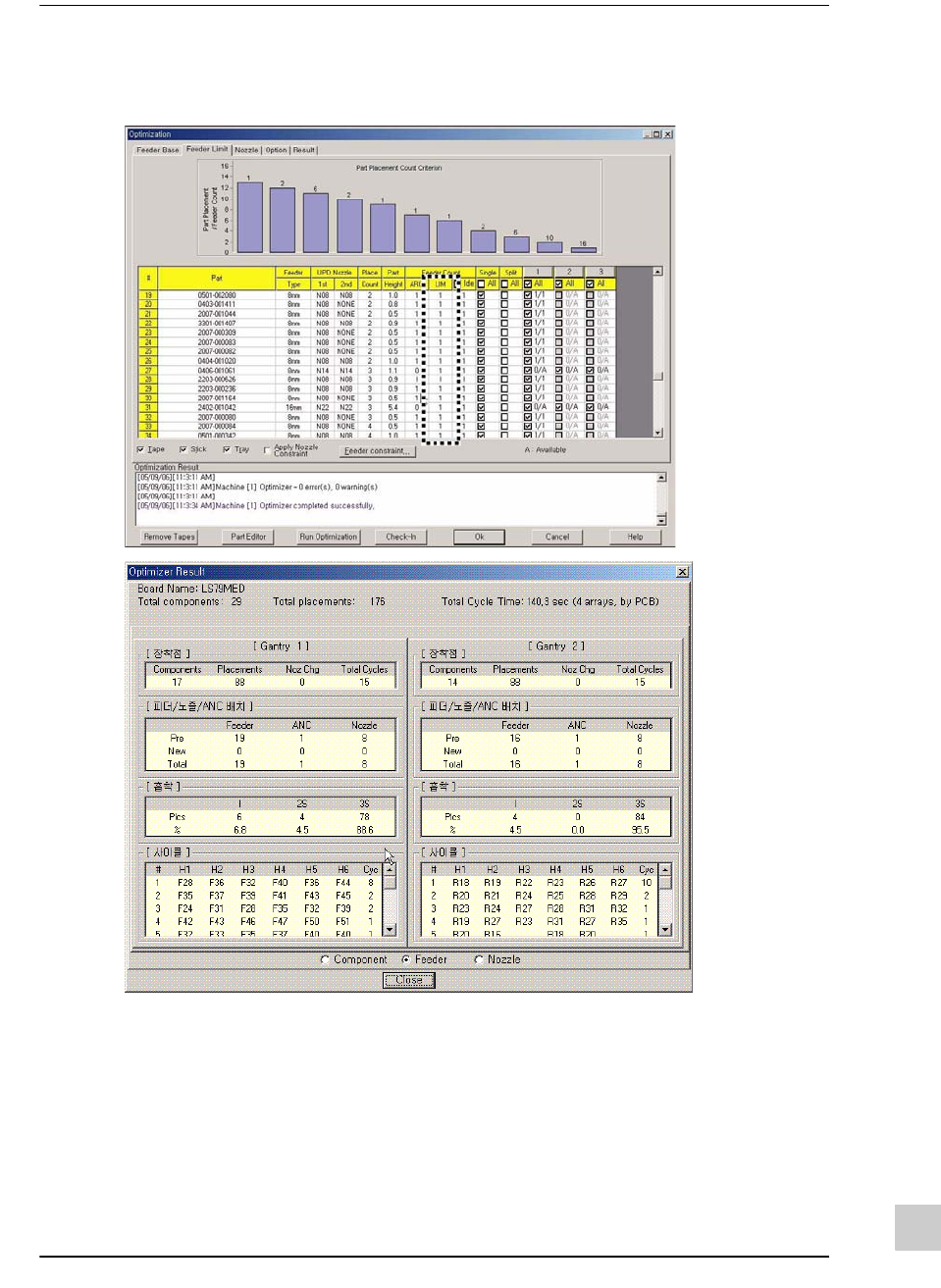 下图是针对作业较多的元件的喂料器数量范围设定及针对该设定的优化结果屏幕。