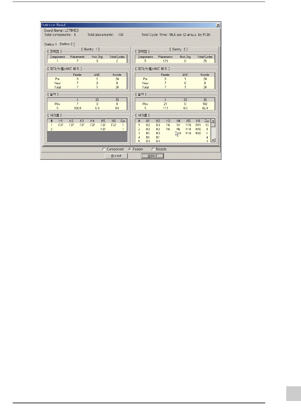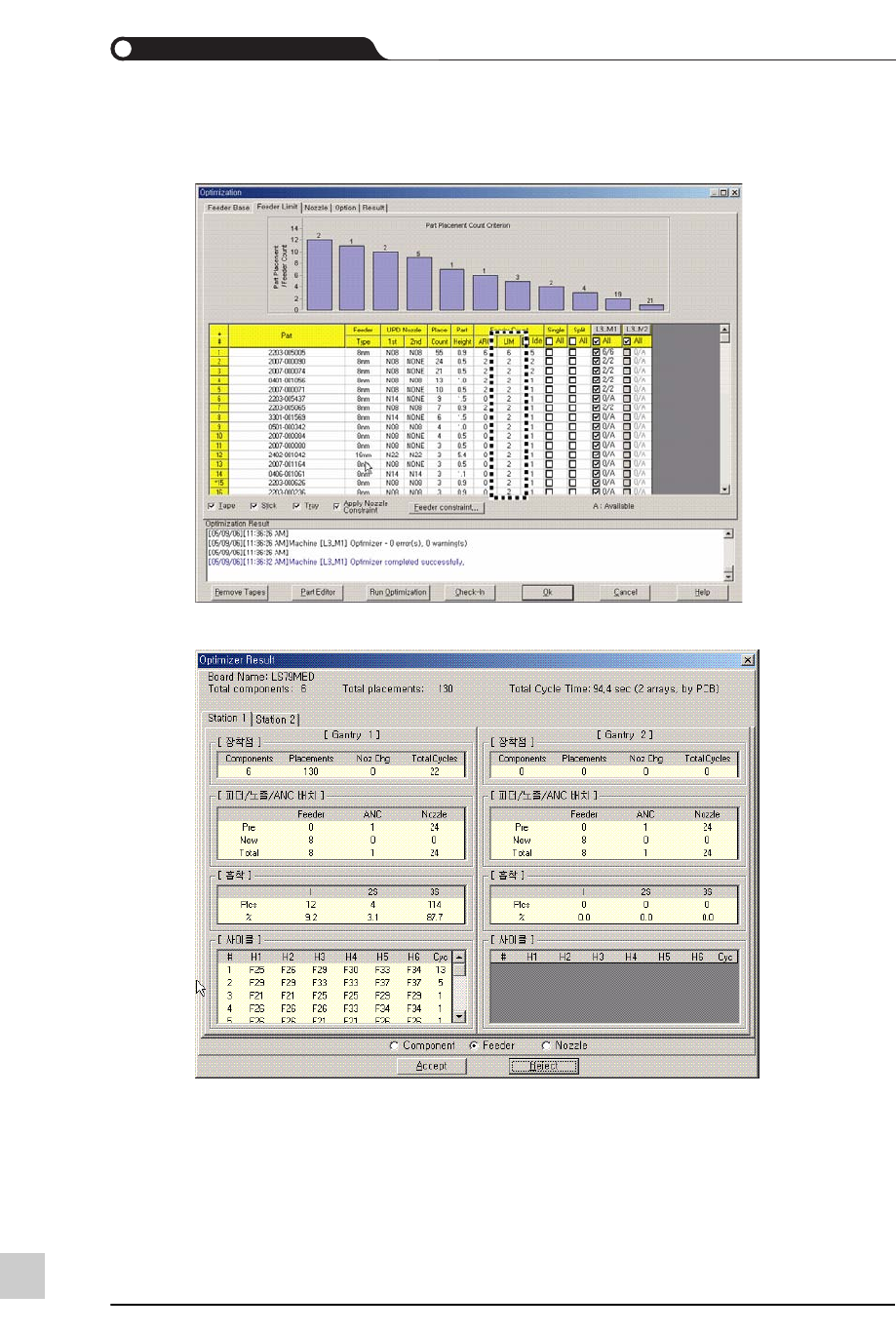 下图是Twin 模式下的喂料器数量范围设定值的修改与优化结果屏幕。所有元件的喂