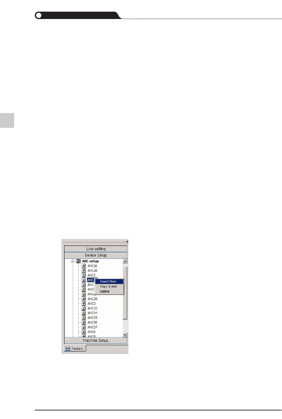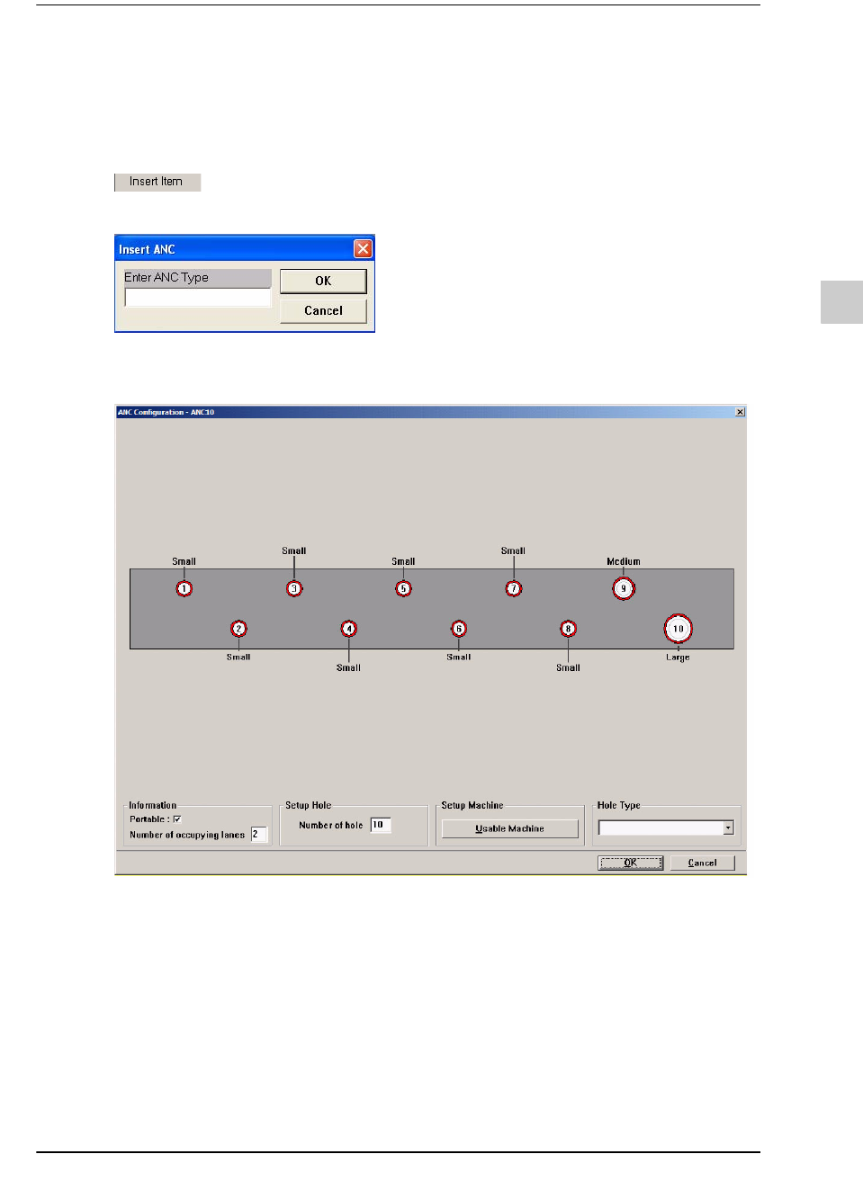 8-37 Line Modeler Insert Item 在子菜单选择 Insert It em 。 设定装置名称。 设定的装置名属于固有值, 需要慎重取名。 使用者双击 ANC 装置形式中的一个, 即可查看下列 ANC configuration 。 下面是双击 ANC10 时的举例。 各栏目的说明如下 : Delete Item 从目录中删除选定的 AN C 。 Tit le b ar ANC 名 Graphic 区 孔配置、 孔…