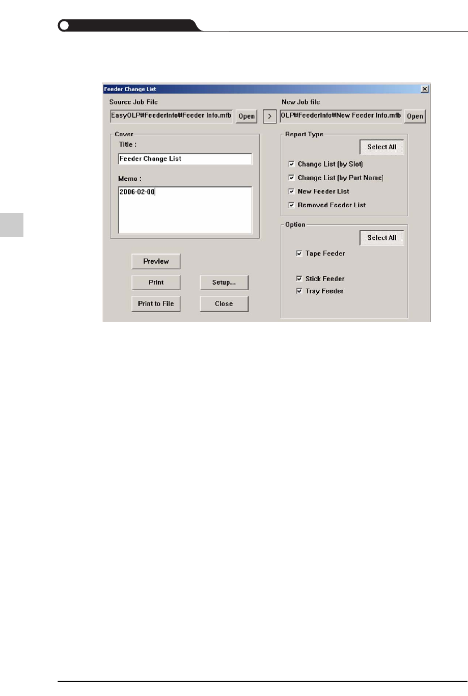 9-45 EasyOLP 喂料器配置信息文件 (*.mfb) 的创建方法如下。 STEP1. 依序单击 T ool > Optimization 。 STEP2. 在 FeederBase 选项卡单击 <Export All FB's> 键。 STEP3. 设定了储存位置与文件名后, 单击 < 储存 (S )> 键。 <Print to File> 打印到文件。 输出的文件是文本格式 …