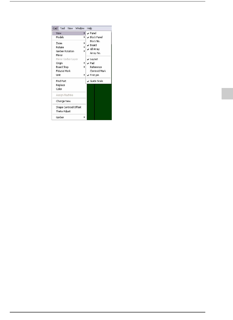 9-47 EasyOLP STEP2. 选择 CAD > V iew 菜单后, 将出现下列选项。 各选项的说明如下。 9.5.2. Model 如果是混流生产则选择目标型号。 详细内容请参阅 [9 .12. 混流生产 , 第 9-163 页 ] 9.5.3. Zoom STEP1. 可以选择是否在 Board V iew 区放大或缩小显示 PCB 。 Panel 面板 (Panel ) 的外廓线。 Board 电路板的外廓线。 L…