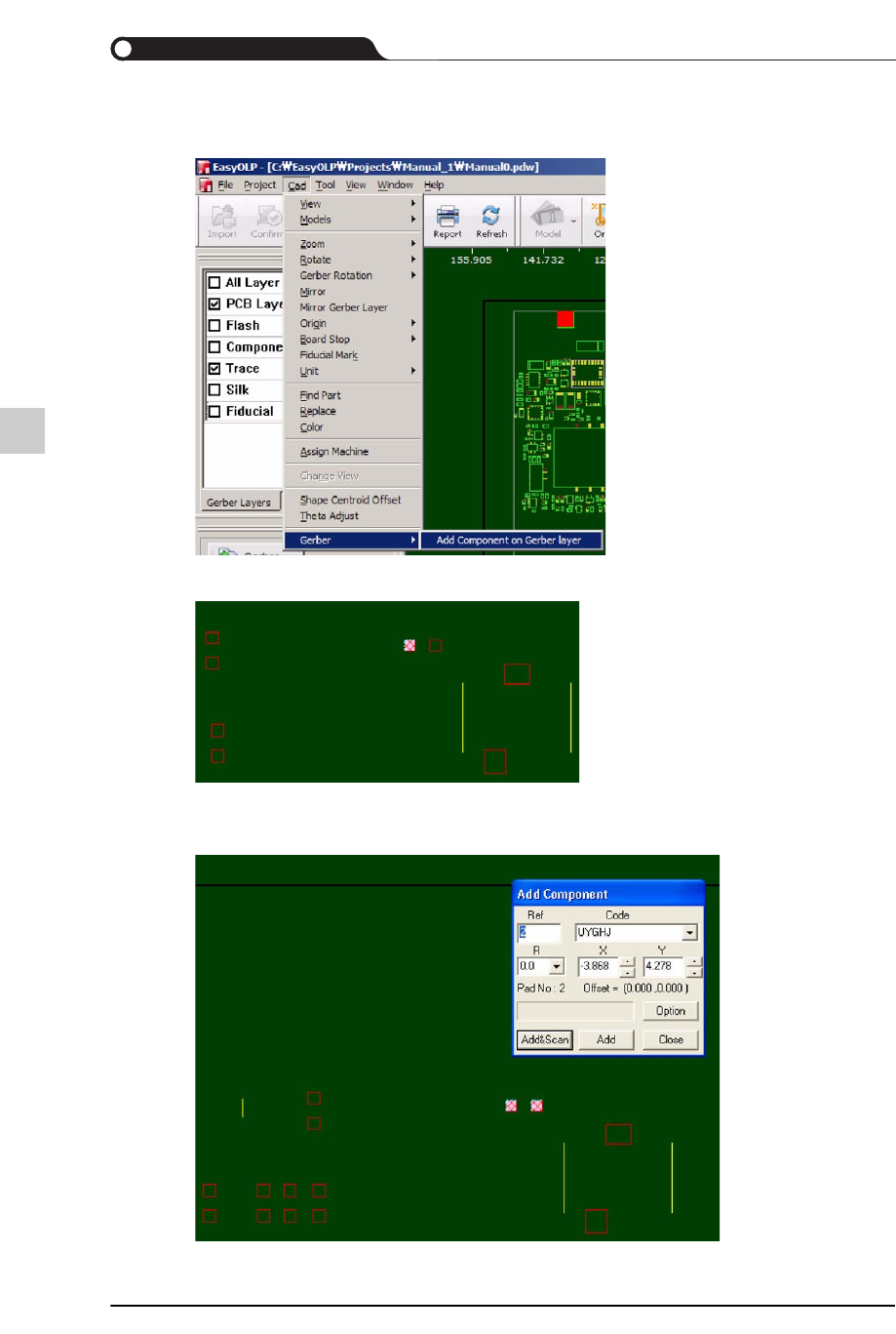 9-62 lvswG}] lvswG}] 在 CAD 菜单上选择 “Gerber” 子菜单后再选择 “Add Component on Gerber Layer” 。 单击需要添加的元件的 Pad 。 双击第二个 Pad 。出 现 “Add Component” 对话窗口后选择该元件的 参考标记的相关 编码后添加元件。