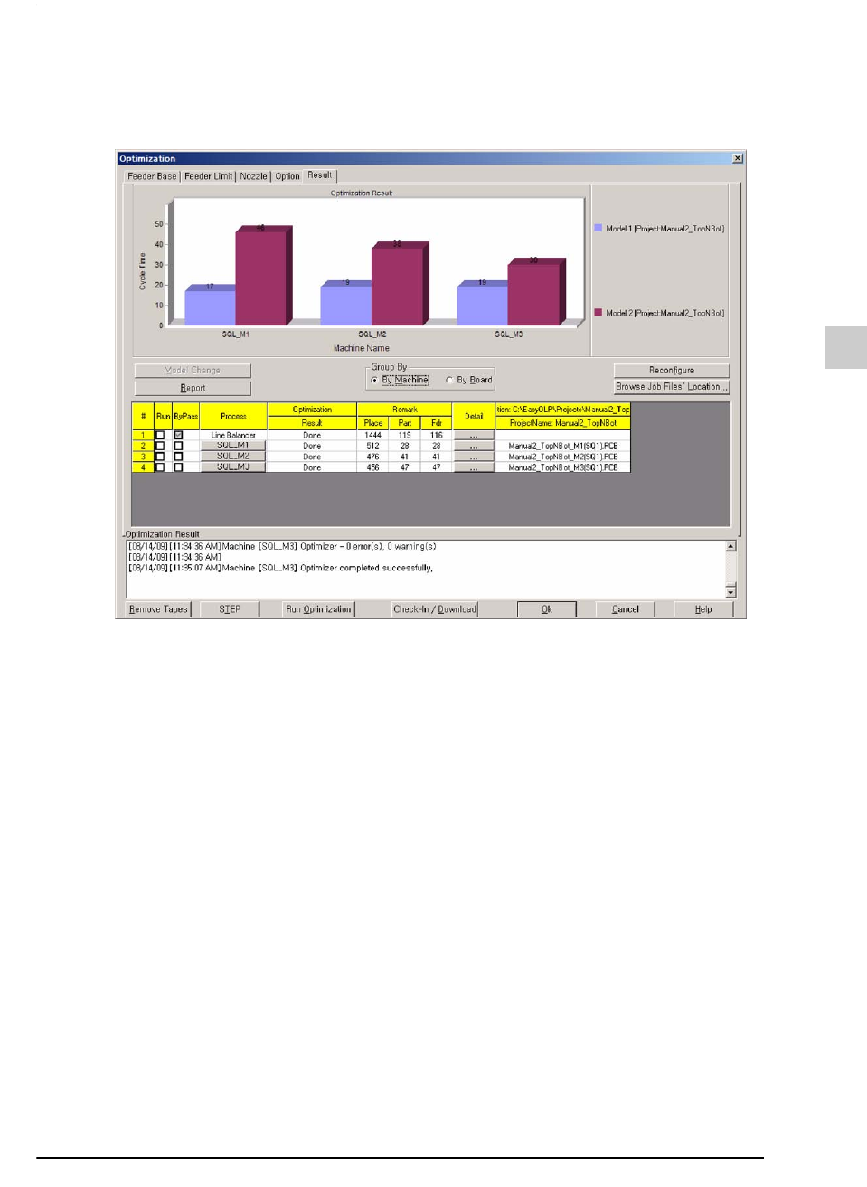 9-171 EasyOLP 9.12.2.15. 优化结果 优化结果窗口上将如下图显示出所有 型号的预测结果。 但是和多重电路板不同的 是, 所有的型号被包含在一个 PCB 里。 9.12.3. 型 号标志设定 为了进行混流生产, 需要设定出可以识别各型号的标志。 此时称其为型号标志设 定。 下图是设定型号标志的对话窗口。 包括了针对单一型号进行设定作 业的 “ 单点设定 ” 与针对各别型号进行设定作业的 “ 各点设定 ” 。