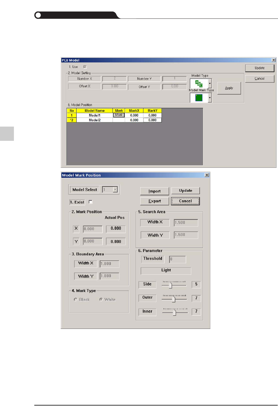 下图是设定型号标志的对话窗口。包括了针对单一型号进行设定作业的“单点设定”