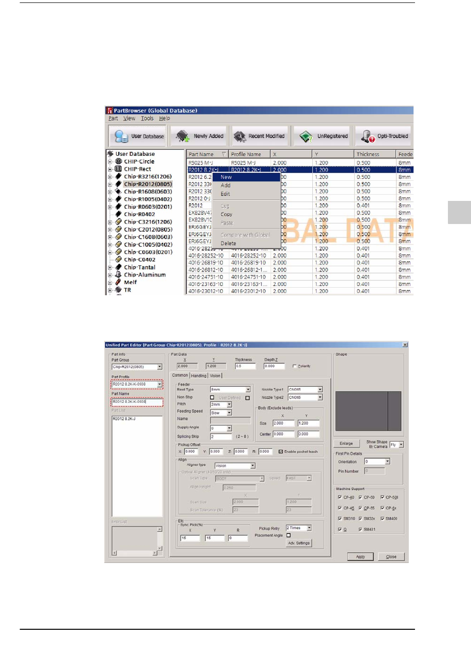 10-15 Part Browser 10.4. Profile/ 元件的添加 / 修改 / 删除 /Line-Global 之间的比较 . 10.4.1. 添 加配置文件 STEP1. 在右边的清单视图选择 “ 新创建 ” , 就能创建新 Part 及配置文件。 STEP2. 输入 Part 配置文件名与 Part 名, 两者须一致。 STEP3. 输入设定值后单击 <Apply> 键时, 即可创建新的配置文件。