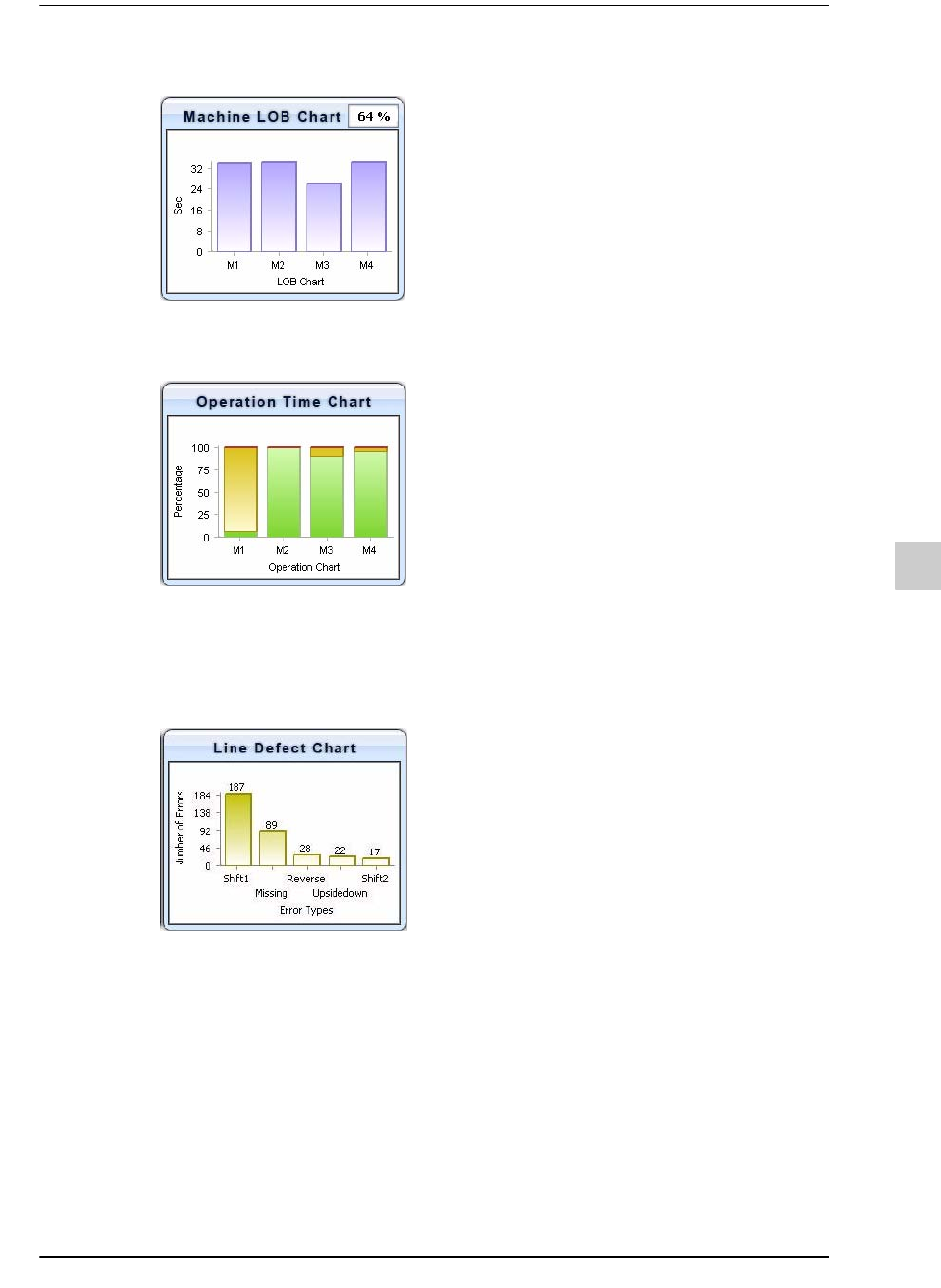 13-9 Multi Line Mo nitoring(MLM) Figure13.1 设备作业线均衡化图表 4) 下图是相应作业线的运转率。 Figure13.2 设备运转率图表 5) 下图是 SLM 与 AO I 设备进行通信时的图表。 显示当前作业线上所发生不良的相 关信息。 如果没有连接 AOI , 则不会出现下图。 Figure13.3 作业线不良信息图表