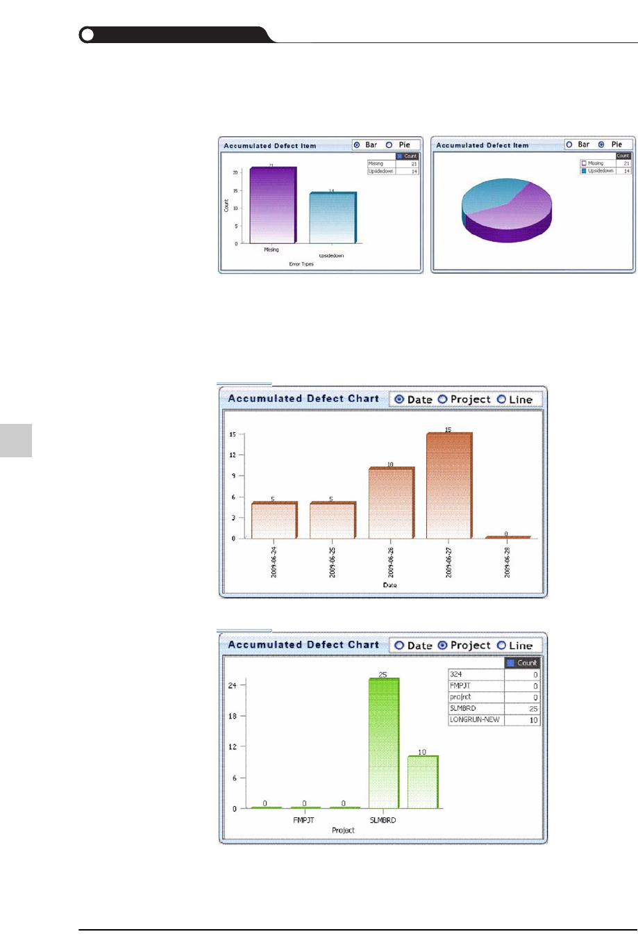13-14 lvswG}] lvswG}] STEP3. Accumu lated Defect Item Chart 显示出查询时段内所发生的不良的 类型与发生频率。 可以根据用户的需要而以条状 (Bar) 图或圆饼图显示。 STEP4. Accumulated Defect Chart 显示出查询时段内每日、 各项目、 各作业线的发生不良率。 Figure13.4 每日不良率 Figure13.5 各项目的不良率