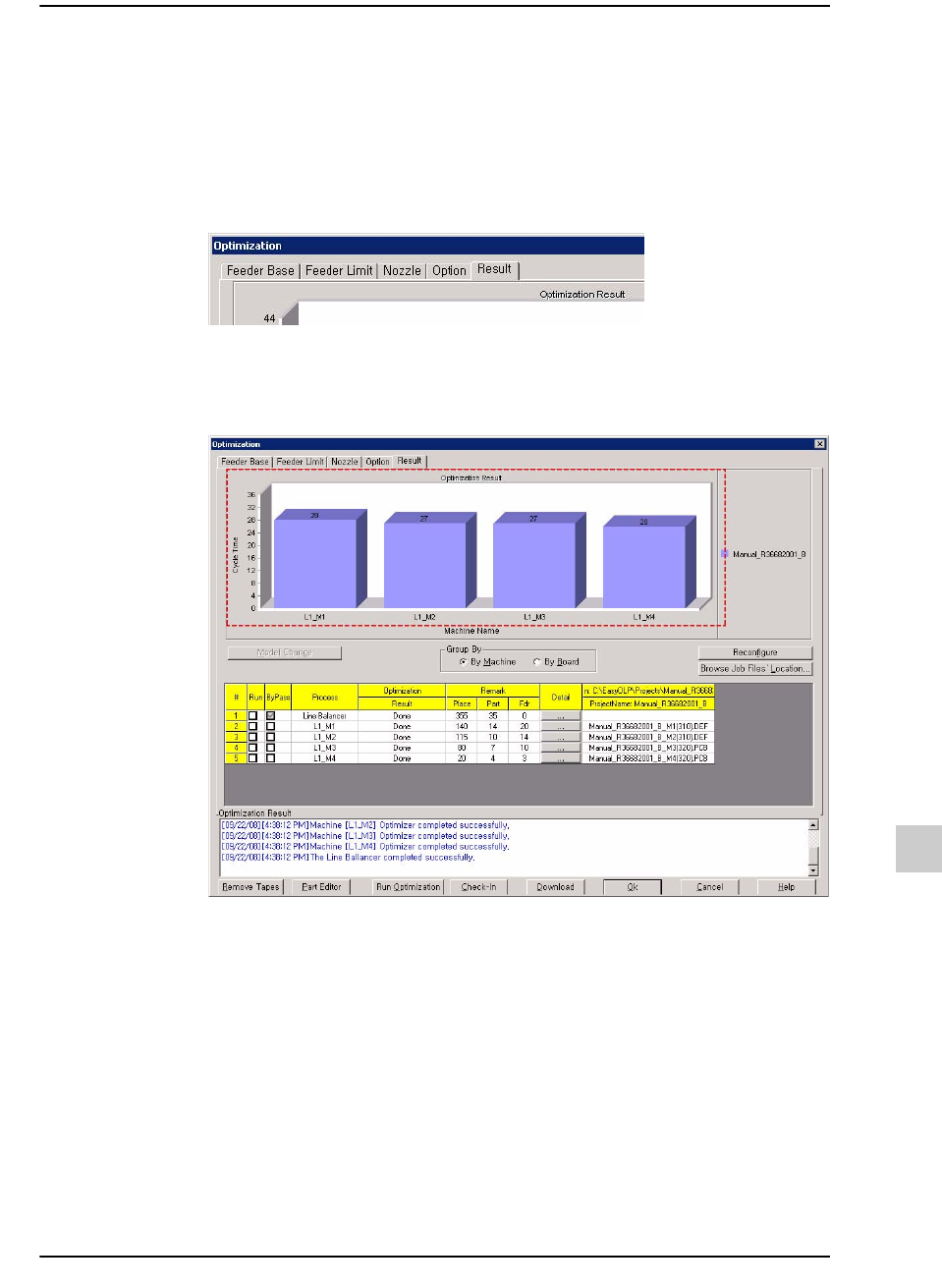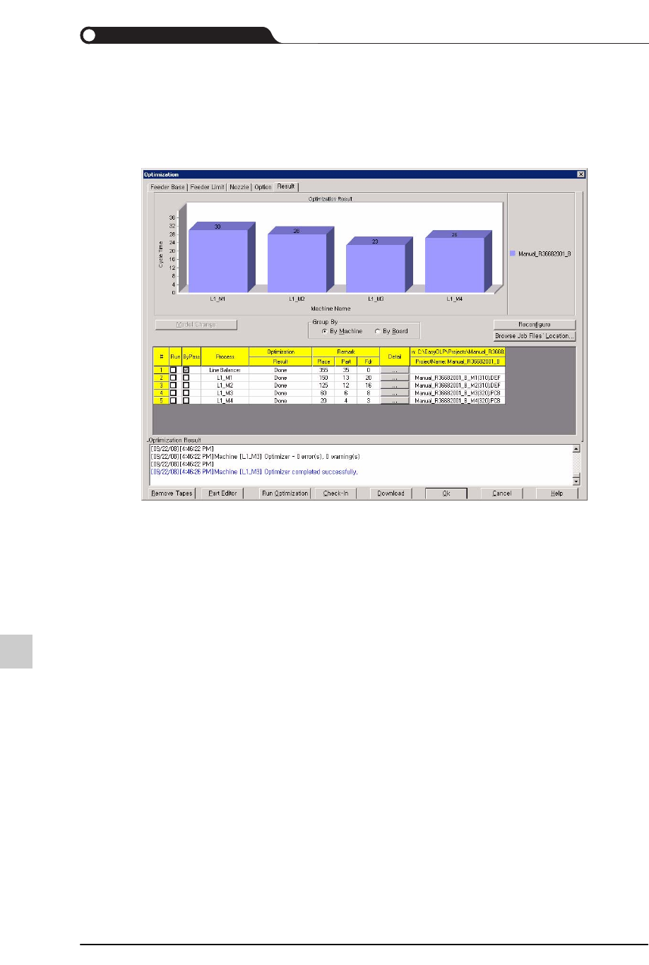 19-13 优化 (Optimization) 19.6. 优化并检查其效果 可以执行优化并检查其效果。 优化并检查其效果的顺序如下。 STEP1. 在 Optimization 对话框单击 Result 选项卡。 STEP2. 单击 Optimization 对话框下端中央的 <Run Optim ization> 键后检查优化效 果。 屏幕上端条状图的高度表示各设备在处理一个 PC B 时所需要的时间 ( 循环时间 : …