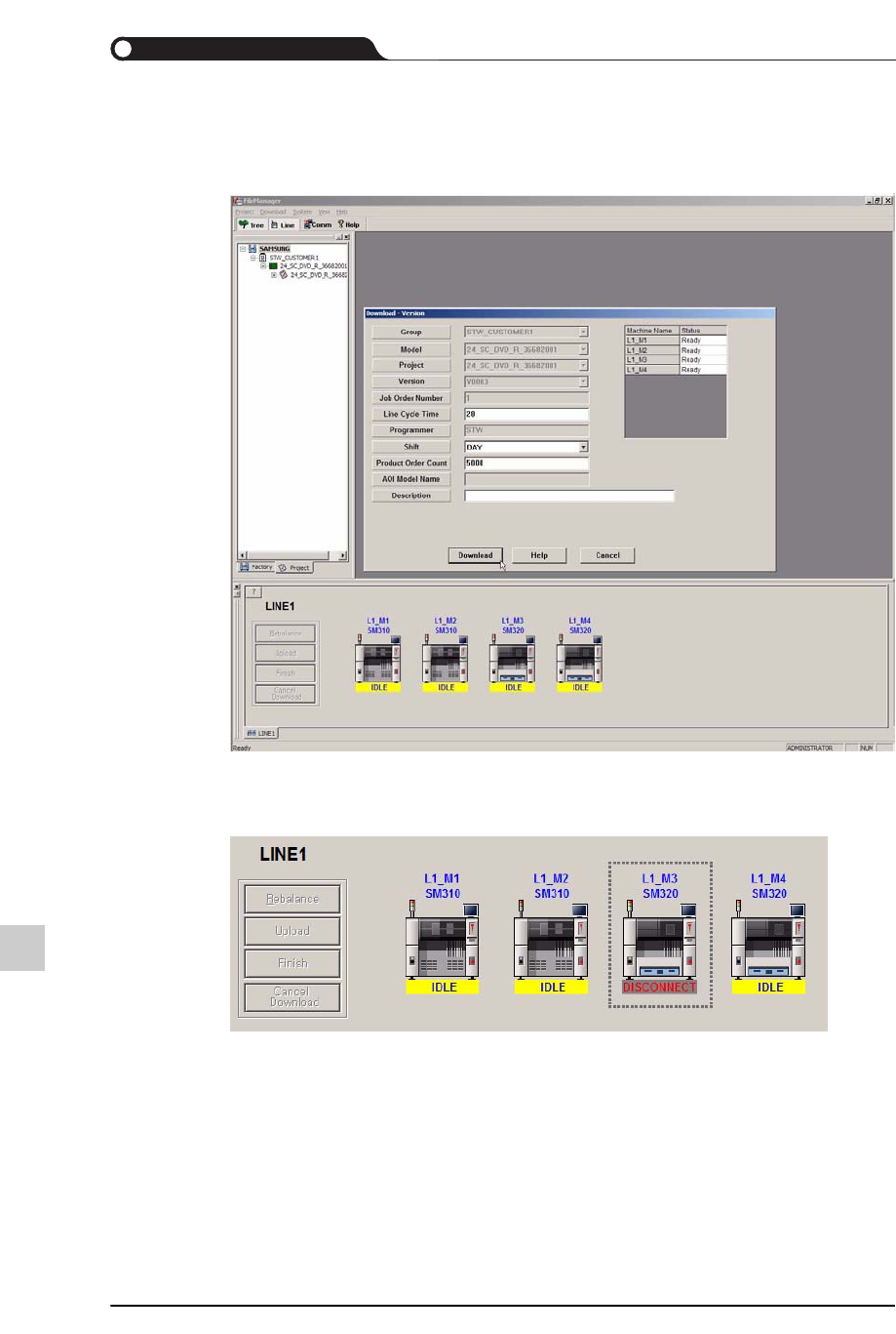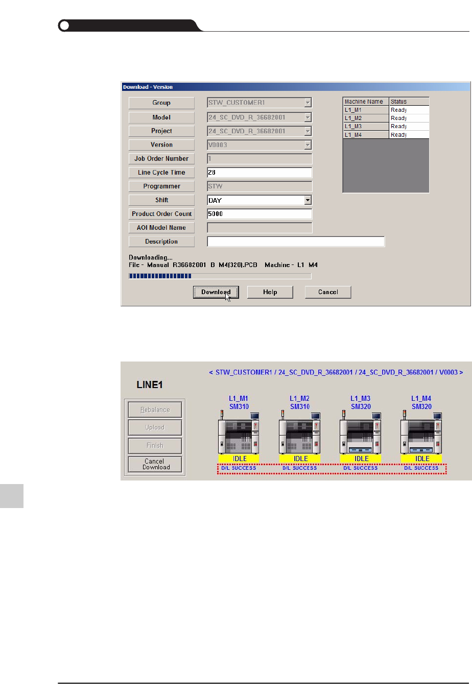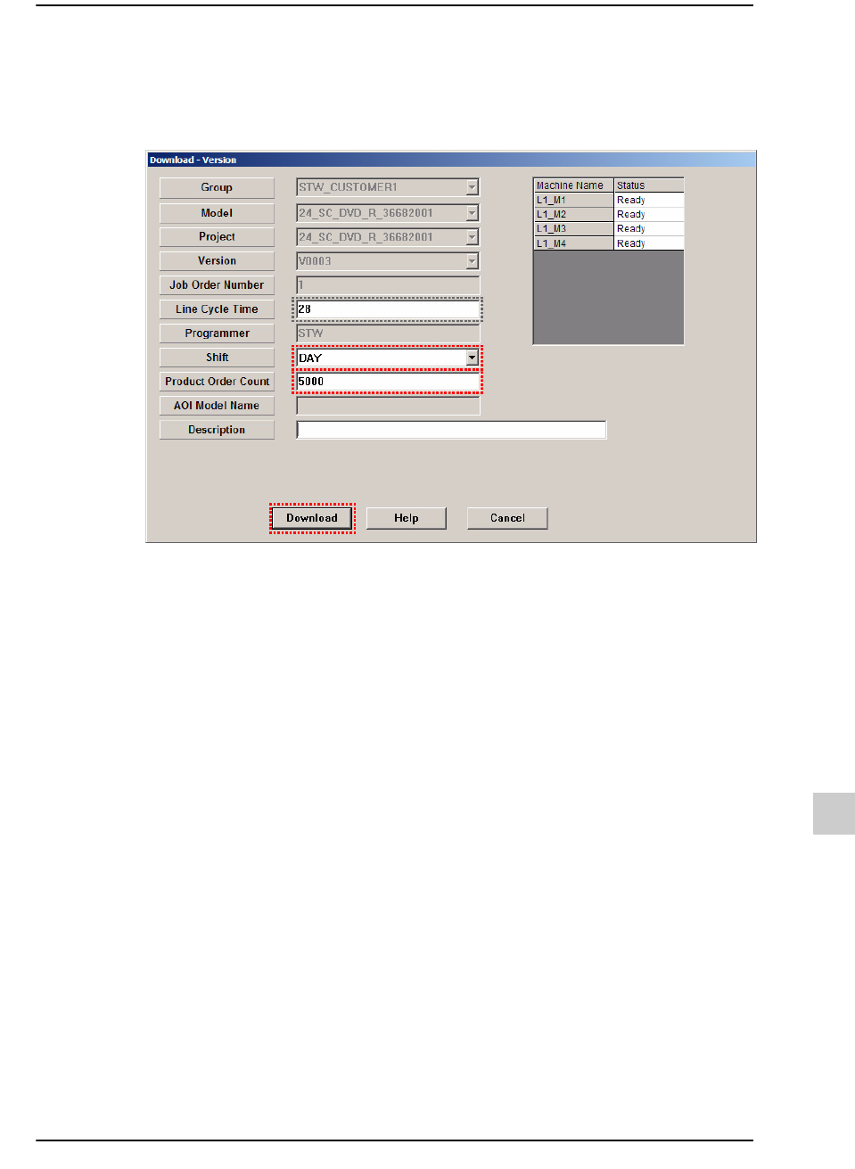 20-7 文件管理 / 传输 4) 检查 Line Cycle T ime 并选择 Shift , 然后输入 OrderCount 。 所输入的 Line Cycle T ime 、 Shift 及 Product O rder Count 将成为 SLM 监控的作业 信息。 输入作业信息后单击 Download 对话框的 <Download> 键。
