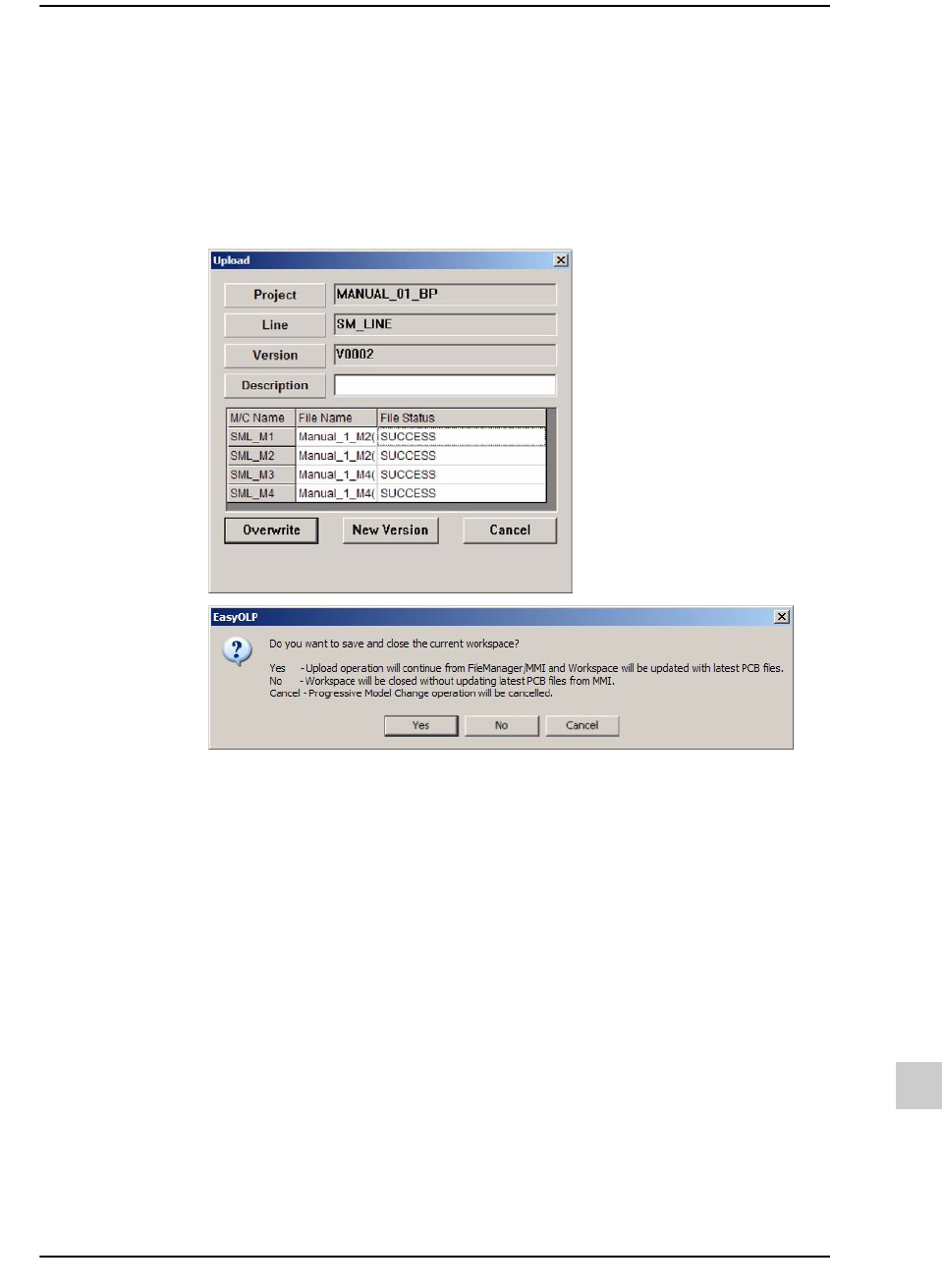24-5 进程中变更型号 (PMC) Job change from the current workspace – Project: 只有在使用了由 Multi Project 构成的工作区时才会被激活。 选择工作 区里的其它项目时可以使用, 在组合框上选择了需要新打开的 项目名 后进行生产作业。 STEP4. 上载目前正在进行作业的程序并进 行 check in 。 文件上载作业及工作区更 新作业完毕后将自动关闭当前工作 区。 …