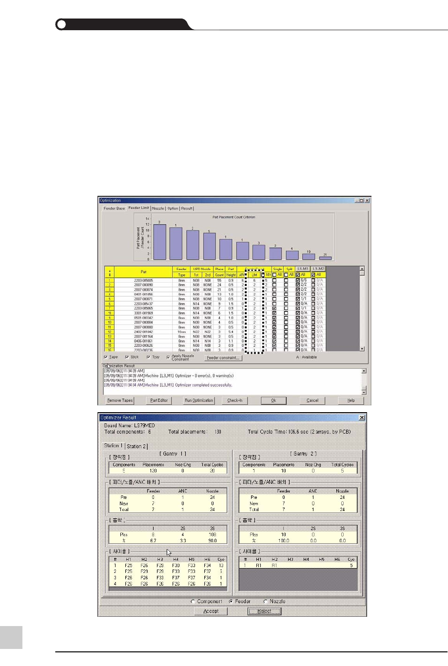下图是针对作业较多的元件的喂料器数量范围设定及针对该设定的优化结果屏幕。
