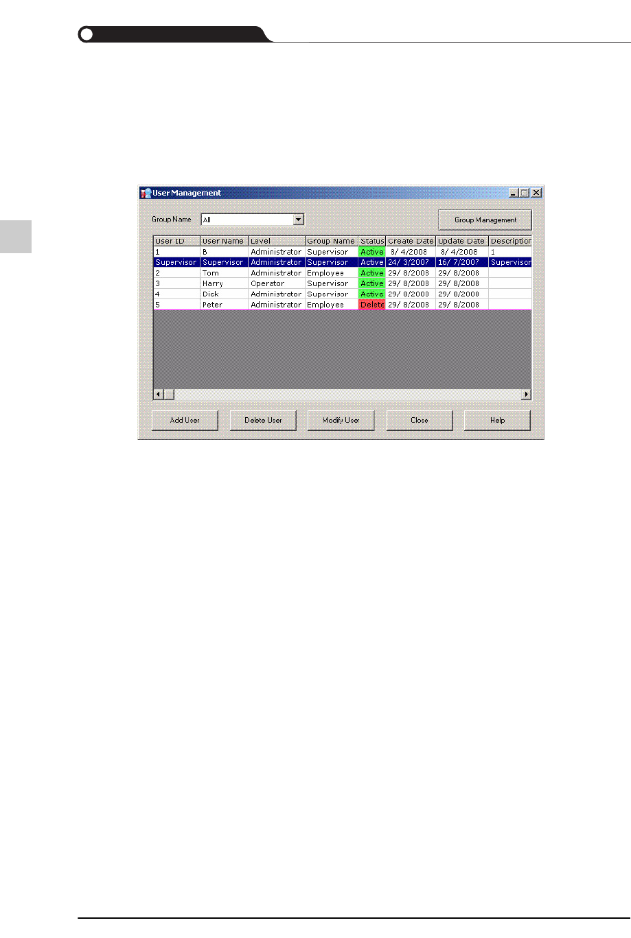7-3 User Manager 7.2.2. 使用者接入限制 如果使用者以管理者 (Administrator) 权限接入时, 使用者可以进行一切操作。 其它使用者 ( 开发者、 程序员、 组长、 服务工程师等 ) 不能在 User manag er 进行任何 操作。 Delete User 可以从 User Man ager 数据库删除现有的使用者。 Administrator 可以从 User Management 画面中选择该使…