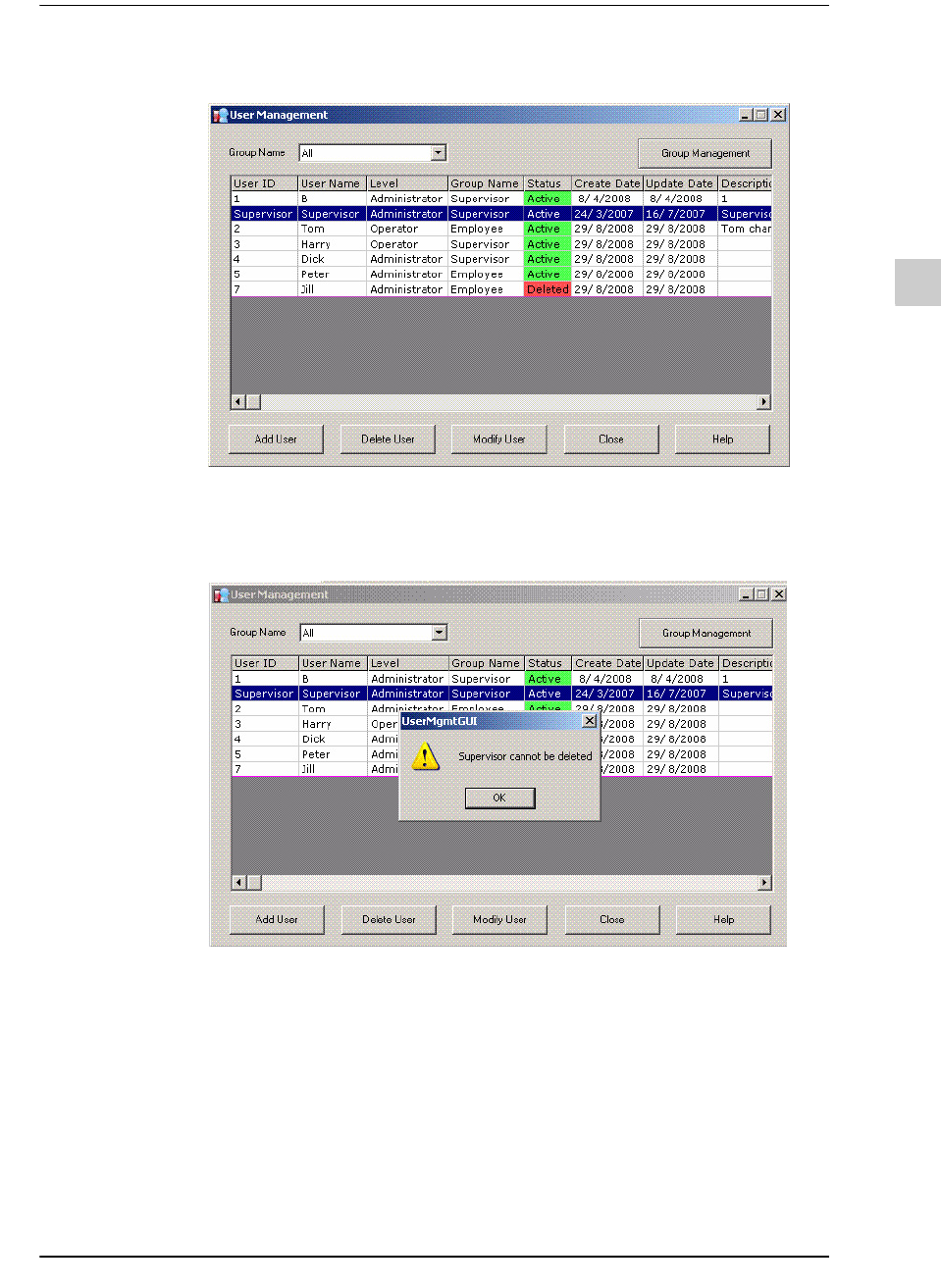 STEP1. 选择了需要删除的使用者ID后单击<Delete User>键。选定使用者如下图成