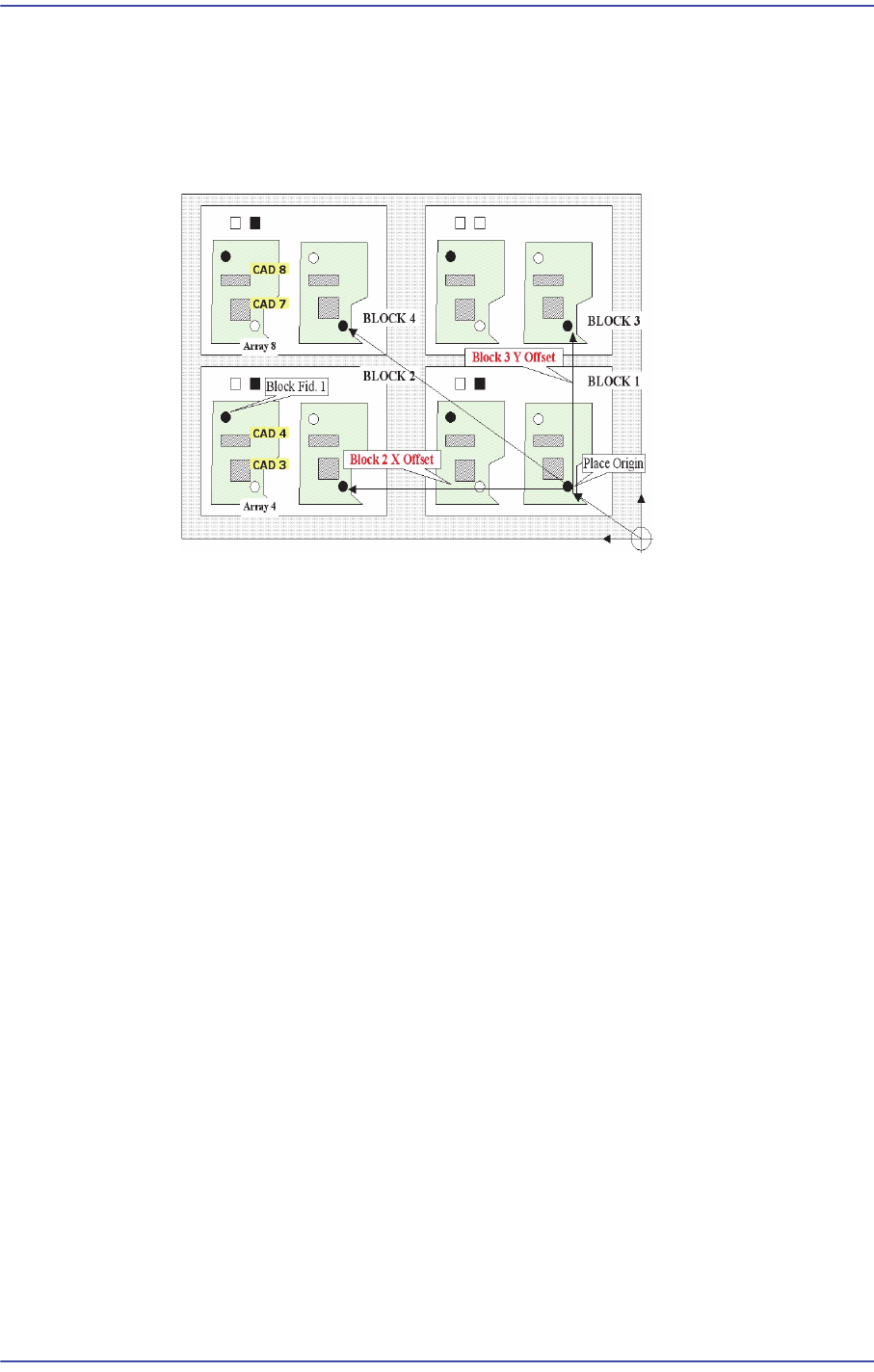 Array PCB내의 첫 번째 소형 PCB의 기준 Fiducial을 원점으로 해서 설정된