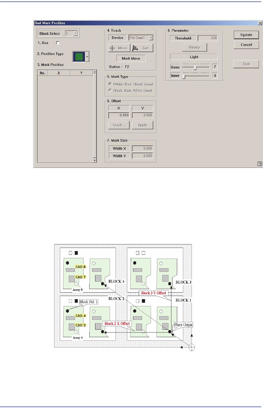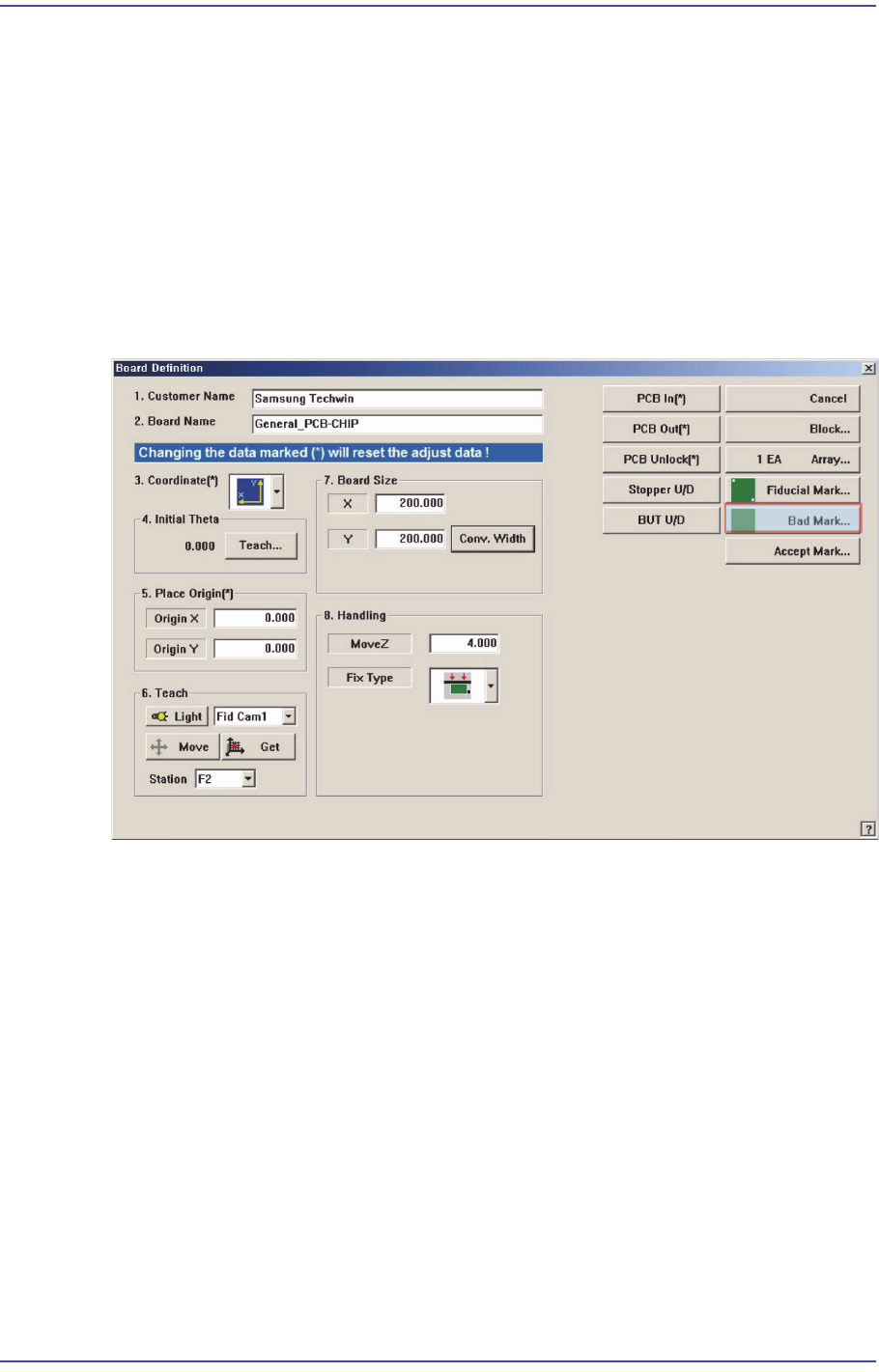 6-27 Board 정의 7) 피두셜마크 인식 테스트 8) 튜닝 최소 2 회 이상 실시 9) 설정값 반영 : <U pdate> 버튼 클릭 6.4. Bad Mark 설정 Array PCB 내의 소형 PCB 가 양품인지 불량품인지를 PCB 상에 표시하는 마크를 ‘배 드 마크’ 라고 하고 , 불량품으로 표시된 소형 PCB 는 작업하지 않습니다 . <Bad Mark … > 버튼…
