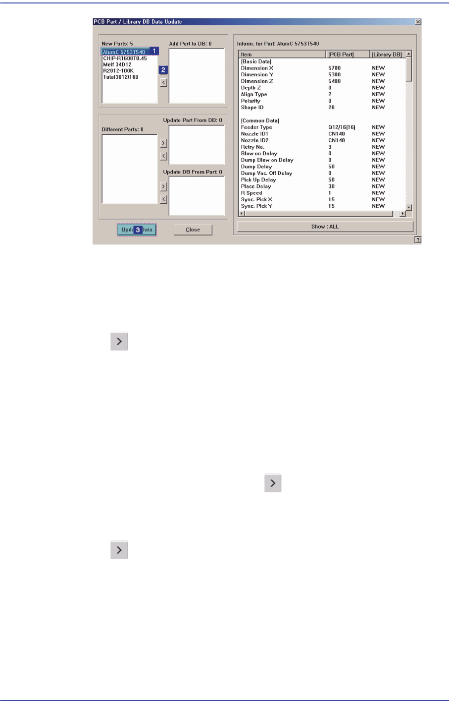 7-4 Samsung Component Place r SM471 Administrator's Guide <New Parts:> 리스트박스 PCB 파일 에 등록된 부품 중 Local Part DB 에는 등록되지 않은 부품들을 보여줍니다 . <Add Part to DB:> 리 스트박스 버튼 클릭 해서 Local Part DB 에 등록할 부품 을 이 리스트박스…