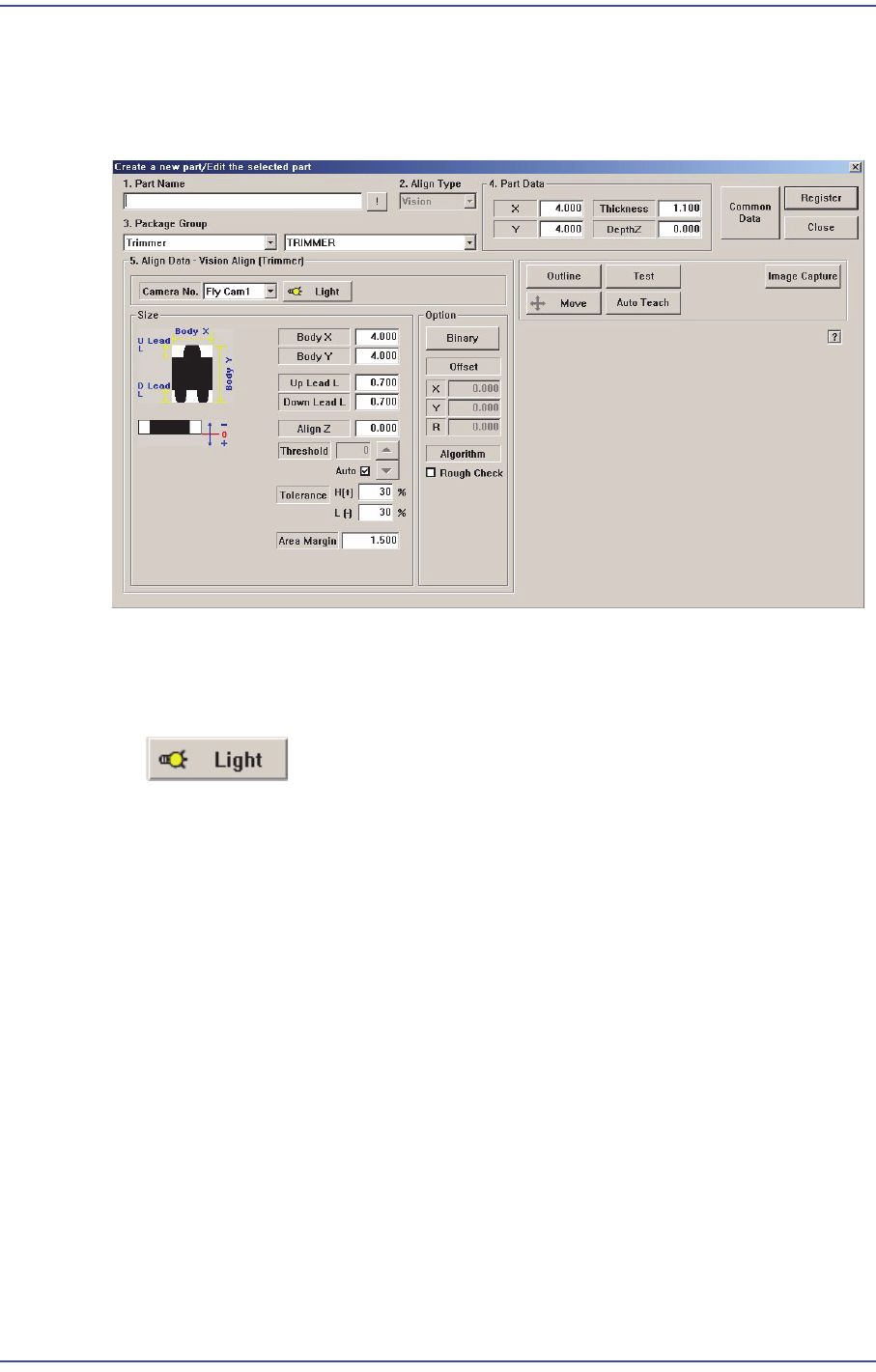 7-47 부품 등록 7.1.2.5. Trimmer 부품데이터 설정 Trimmer 부품에 관한 Align 데이터를 설정합니다 . 그림 7.16 “ Package Group = Trimmer ”인 경우의 대화상자 <Camera No.> 콤보박스 부품을 인식할 Camera 를 선 택합니다 . 자세한 사항은 “ 7.1.1 공통 Align Data ” 참조하시기 바랍니다 . 버튼 부…