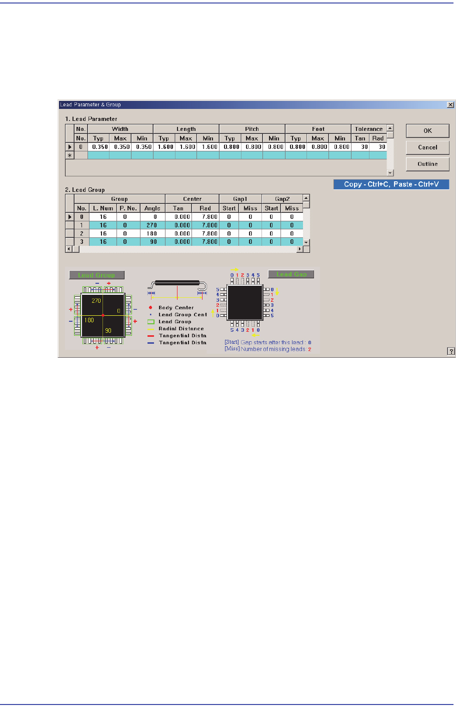 7-64 Samsung Component Place r SM471 Administrator's Guide 부품의 기준점 ( 일반적으로 부품중심 ) 에서 Lead Group 의 중심까지의 법선 방향으로의 거리를 입력합니다 . <Gap1 St art> 열 Lead Group 에서 비어 있는 첫 번째 Lead 를 설 정합니다 . Start 번호의 Lead 다음부터 Lead …