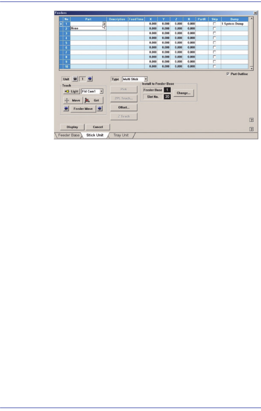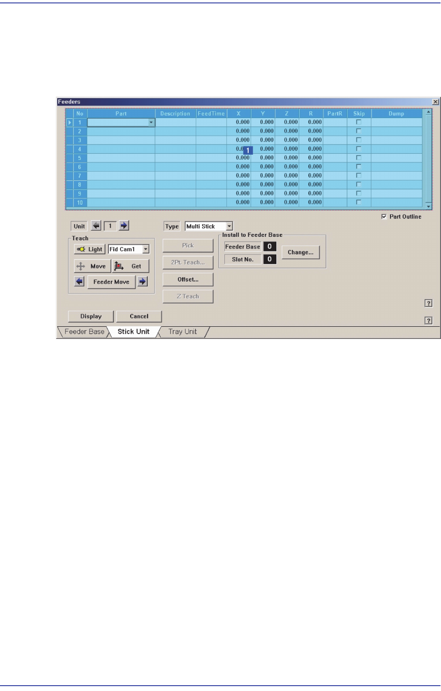 Stick Feeder를 설치하고, Stick Feeder 에 관한 데이터를 설정합니다. “Stick Unit”을