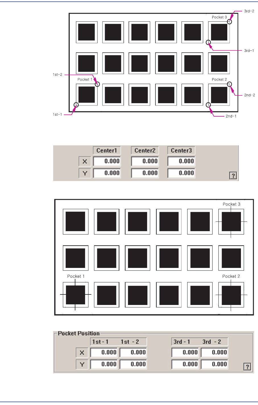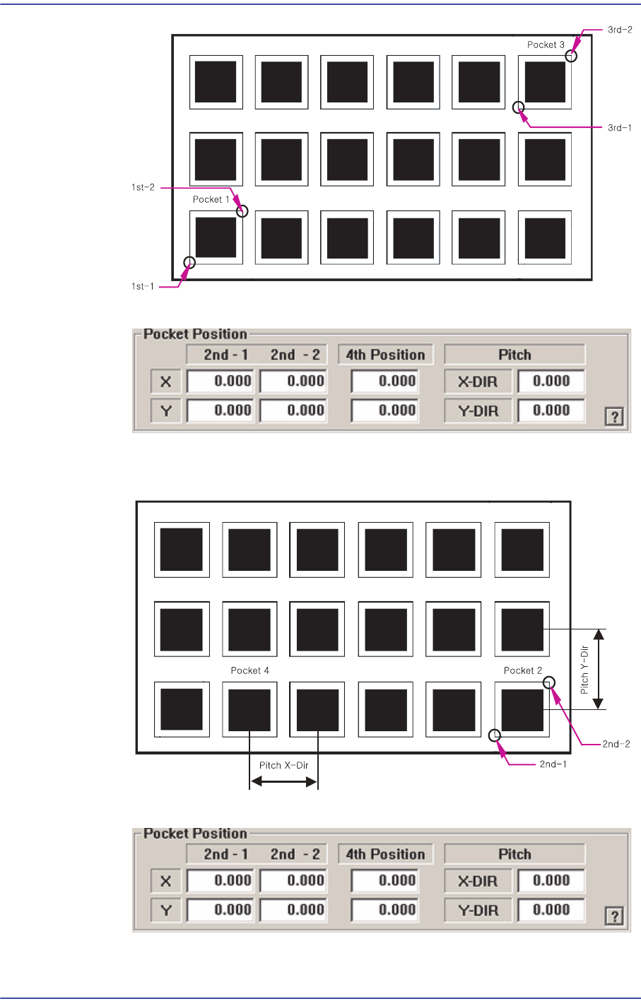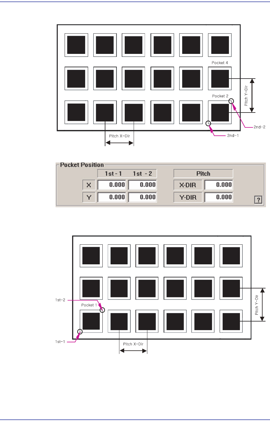 8-24 Samsung Component Place r SM471 Administrator's Guide <2Pocket X-Axis> 아래 그림 과 같이 X 방향의 임의의 한 Pocket 의 중심 좌표 , 2 번째 Pocket 의 대각선 꼭지점 좌표 , X, Y 방향 Pitch 를 각각 입력합니다 . <2Pocket Y -Axis> 아래 그림 과 같이 …